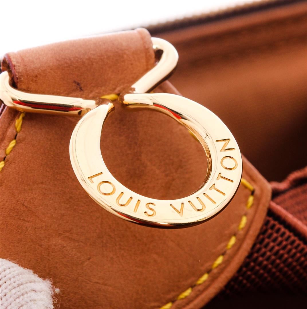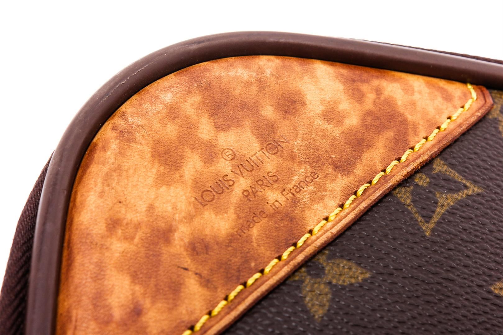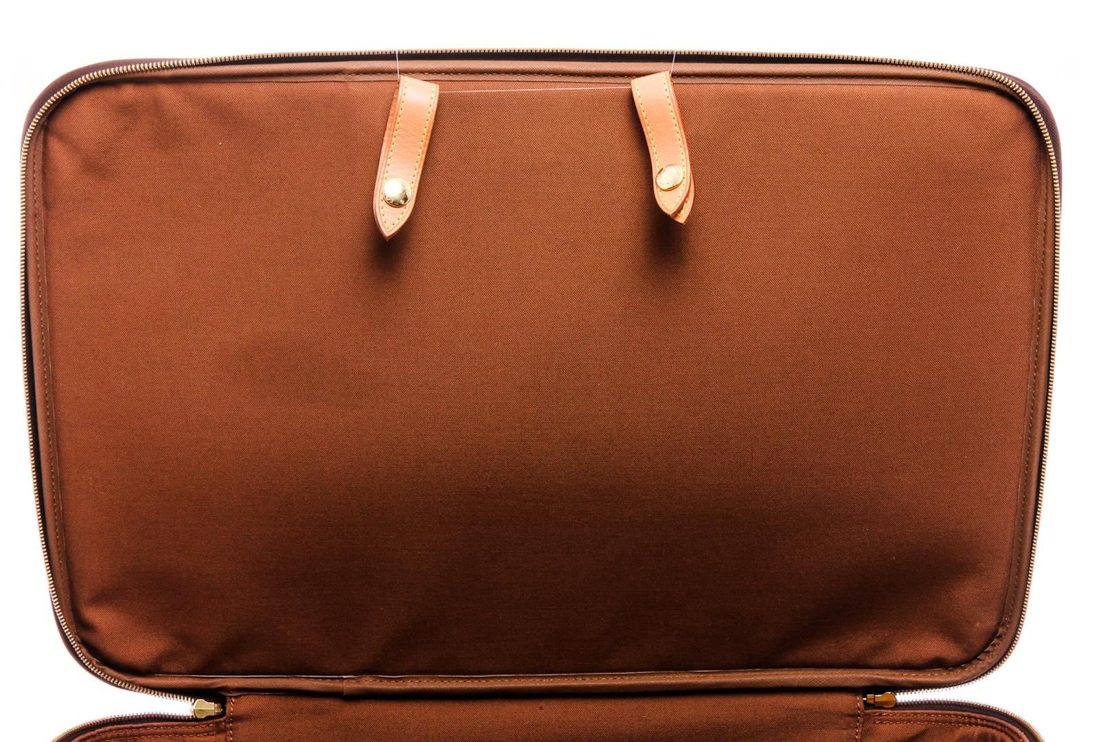 Brown and tan monogram coated canvas Louis Vuitton Pégase 50 with brass hardware, tan vachetta leather trim, single flat top handle, retractable pull handle at top, single exterior zip pocket, dual wheels and protective feet at base, brown nylon lining, compression flaps at interior with velcro closures, dual interior zip pockets and two-way zip closure at exterior.