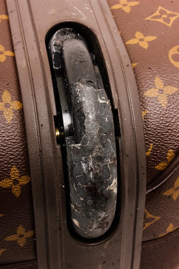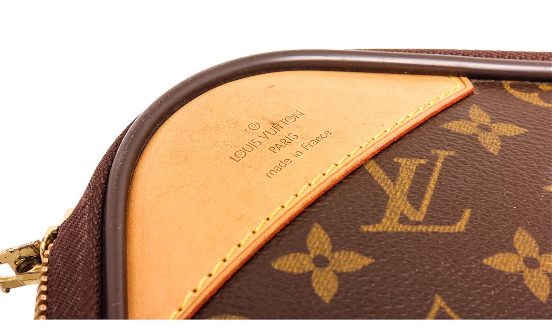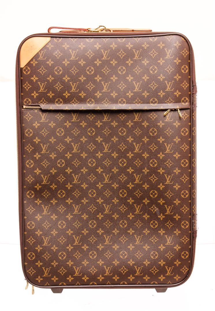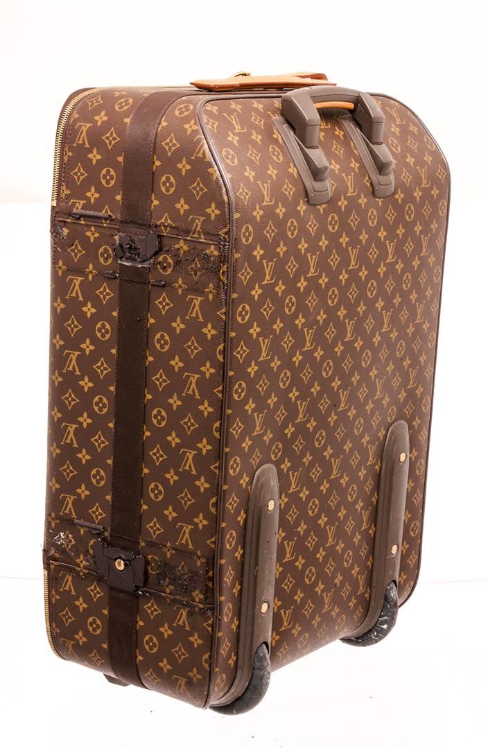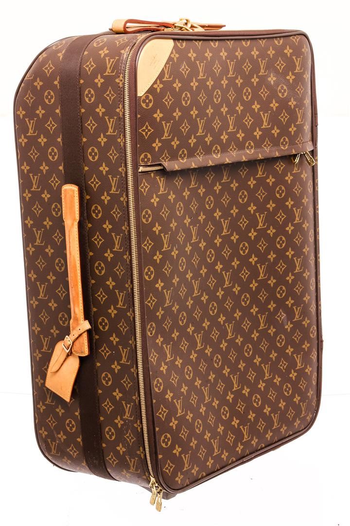 Brown and tan monogram coated canvas Louis Vuitton Pegase with brass hardware, tan vachetta leather trim, single pocket at exterior, dual flat handles at exterior, single telescopic handle, brown canvas lining, single zip pocket and two-way all around zip closure.
