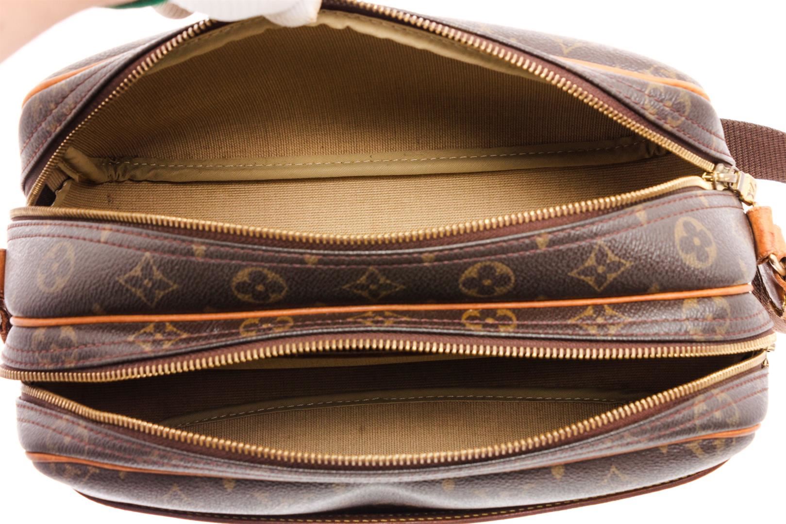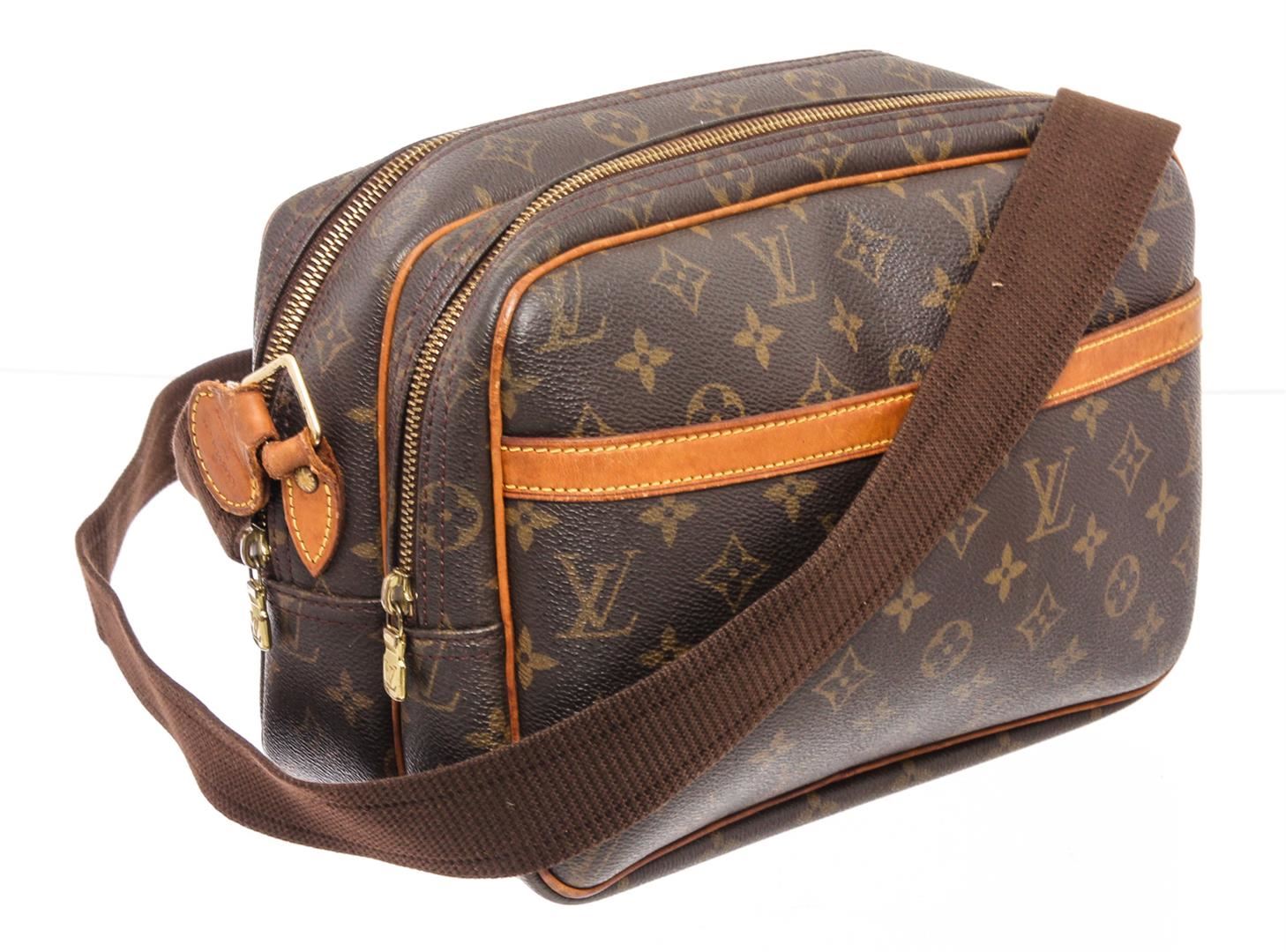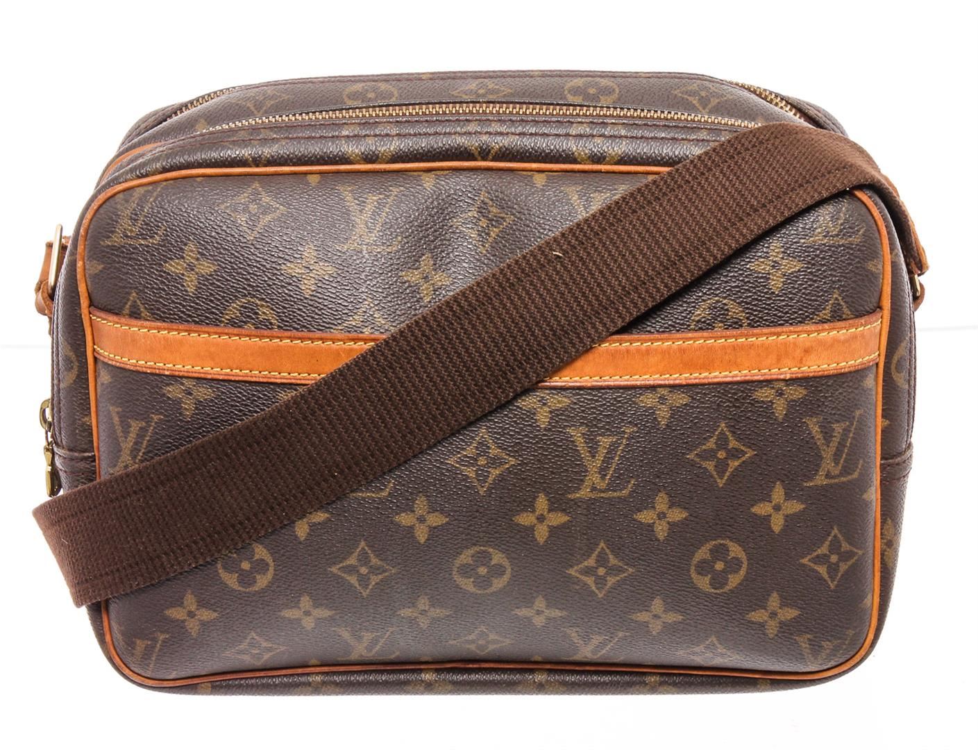Brown and tan monogram coated canvas Louis Vuitton Reporter PM with brass hardware, tan vachetta leather accents, adjustable flat shoulder strap, single exterior pocket, beige coated canvas interior, dual interior compartments, single pocket at interior wall and dual zip closures at top.