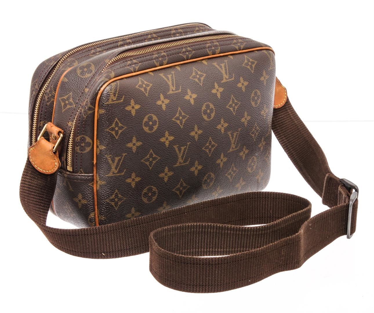 Brown and tan monogram coated canvas Louis Vuitton Reporter PM with brass hardware, tan vachetta leather accents, adjustable flat shoulder strap, single exterior pocket, beige coated canvas interior, dual interior compartments, single pocket at interior wall and dual zip closures at top.