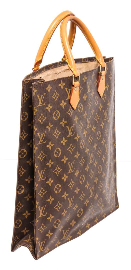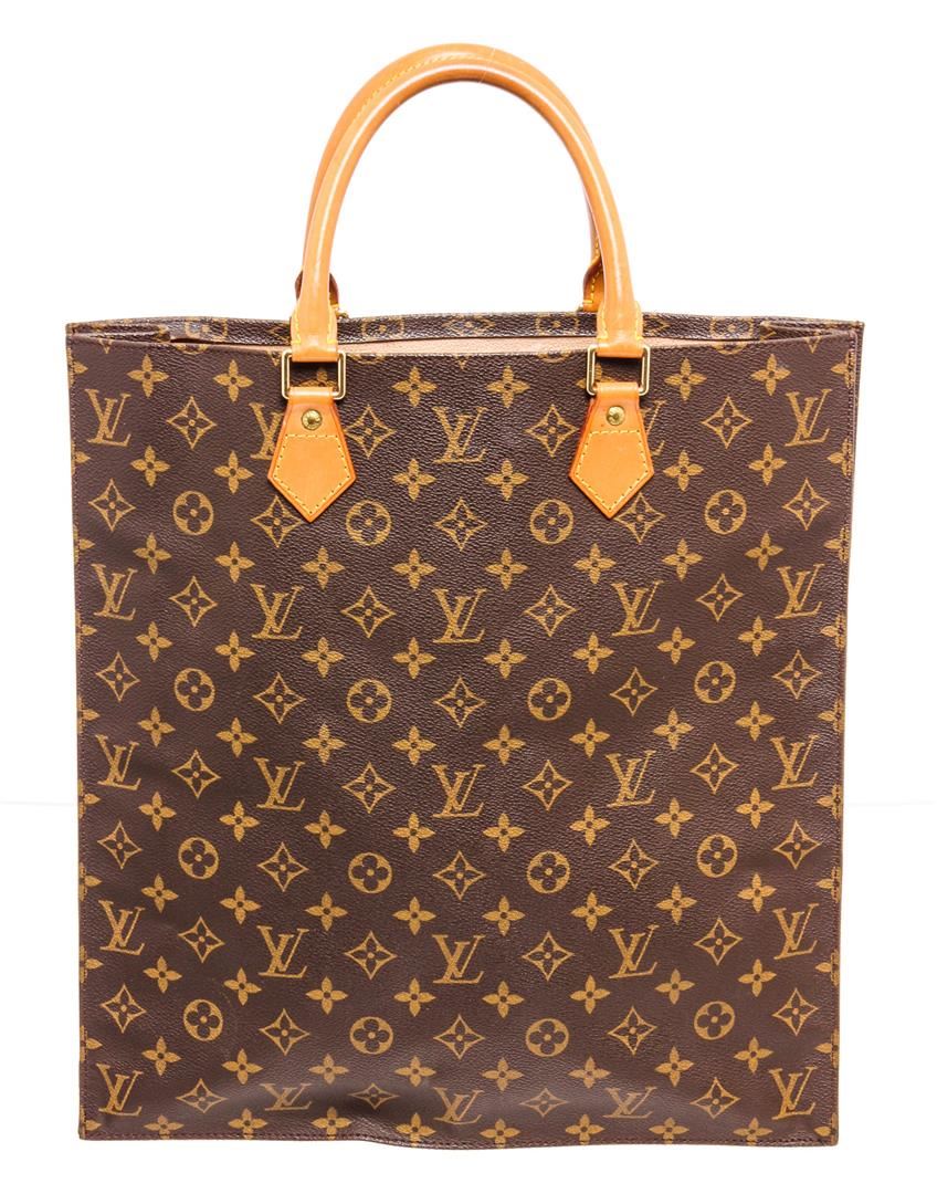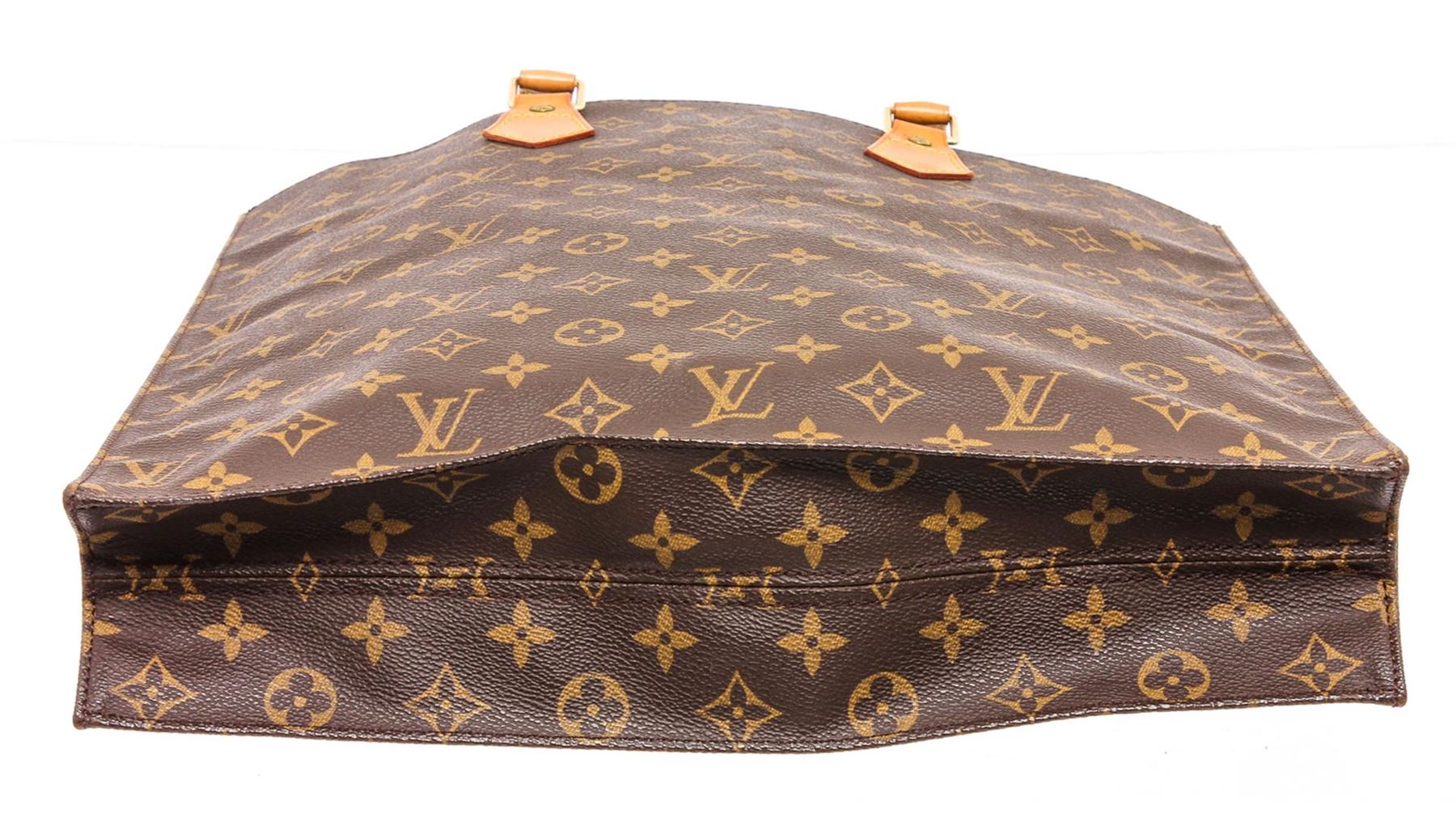 Brown and tan monogram coated canvas Louis Vuitton Sac Plat with brass hardware, dual tan rolled vachetta leather handles, beige coated lining, single slit pocket at interior wall and open top.