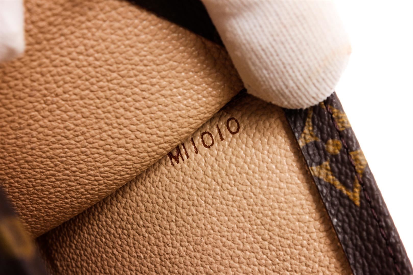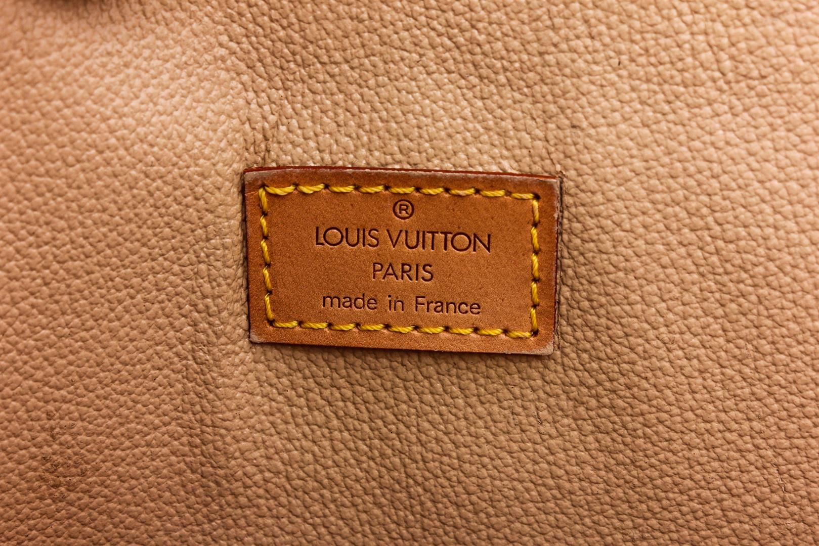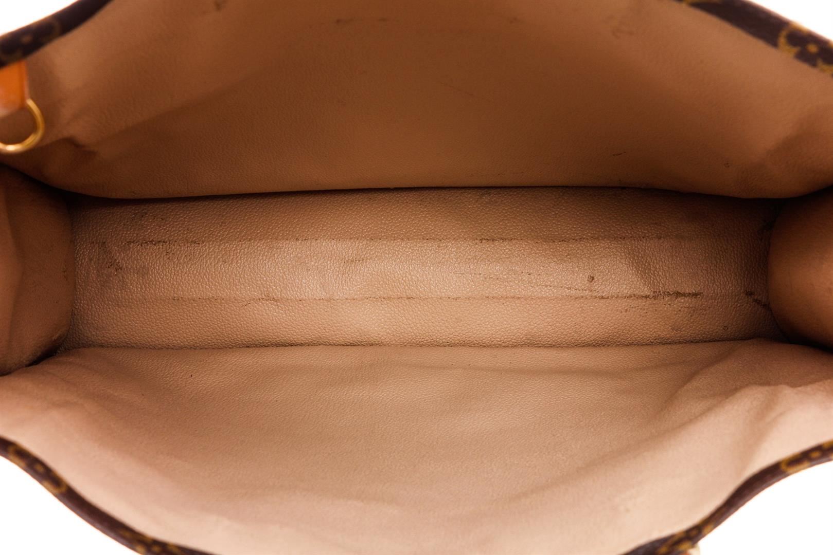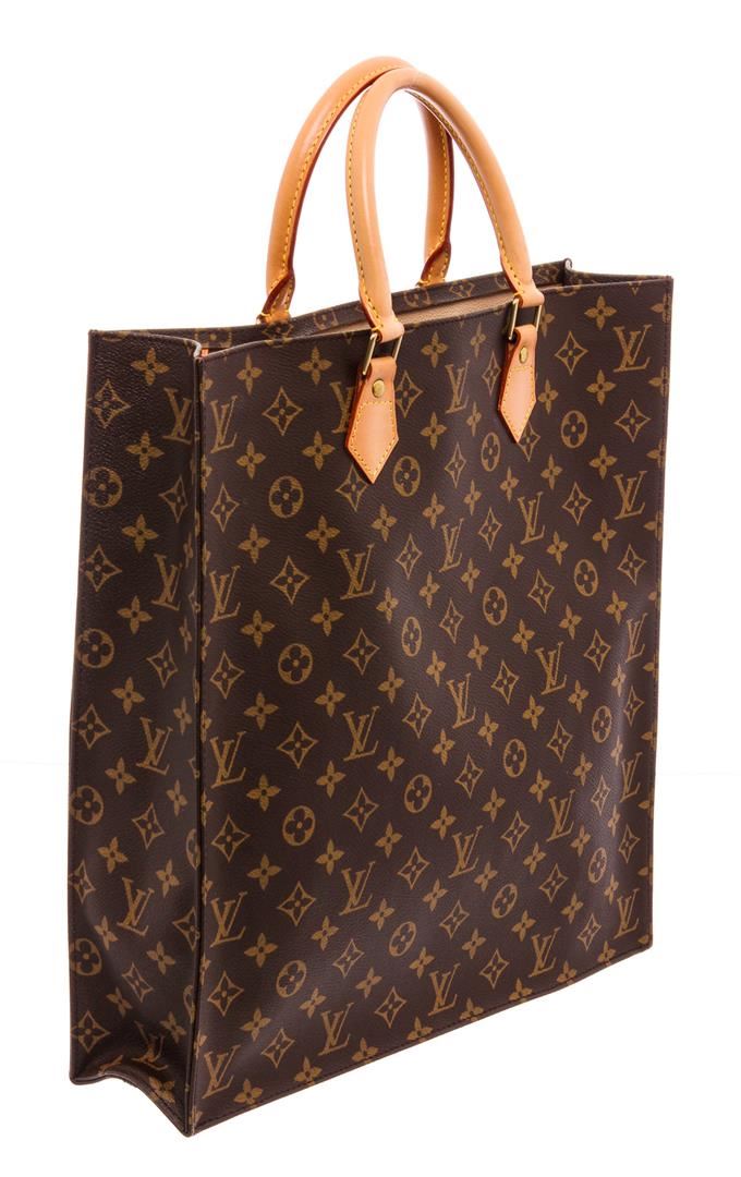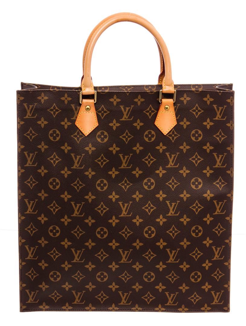 Brown and tan monogram coated canvas Louis Vuitton Sac Plat with brass hardware, dual tan rolled vachetta leather handles, beige coated lining, single slit pocket at interior wall and open top. Please note: Interior material is pealing and very sticky.