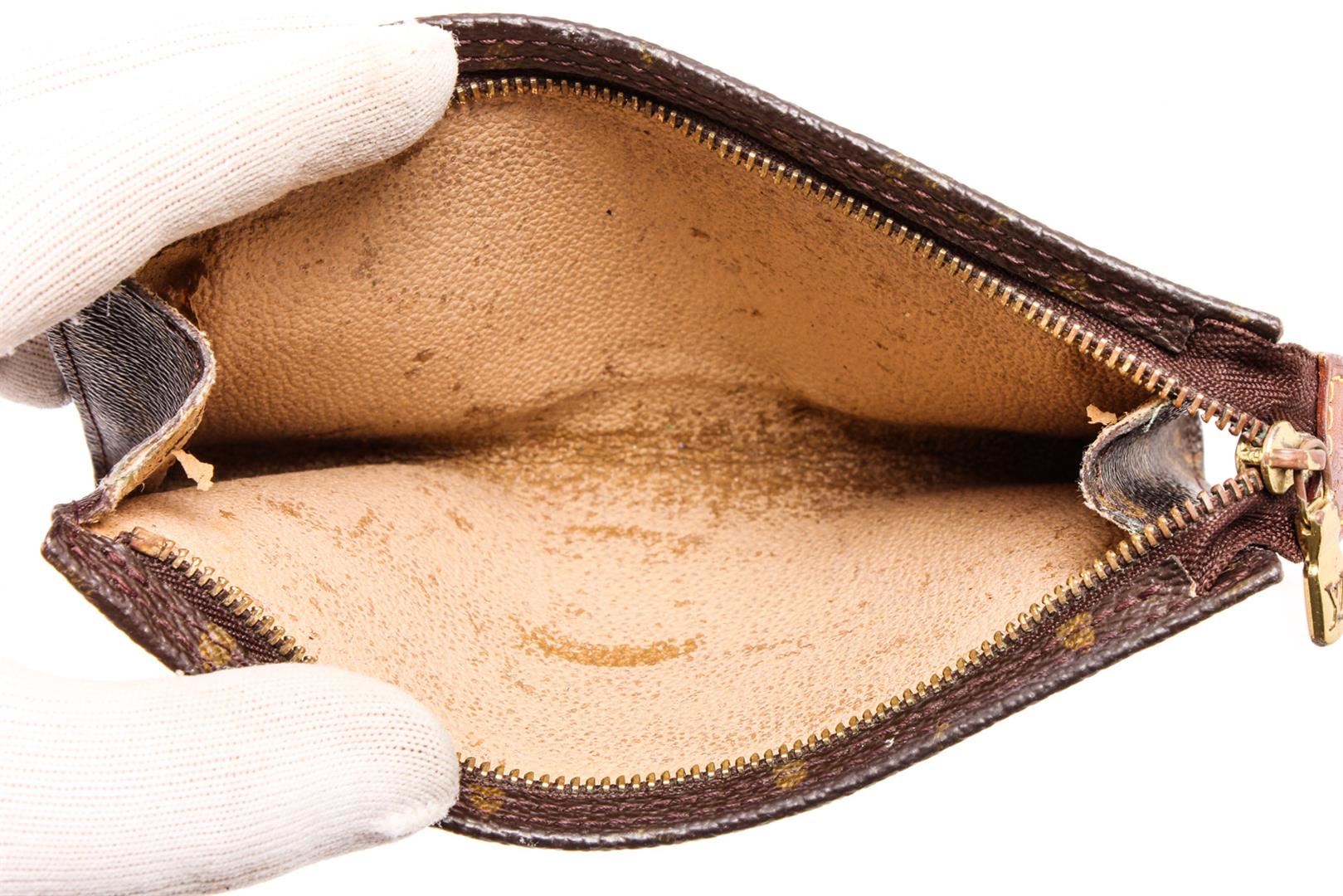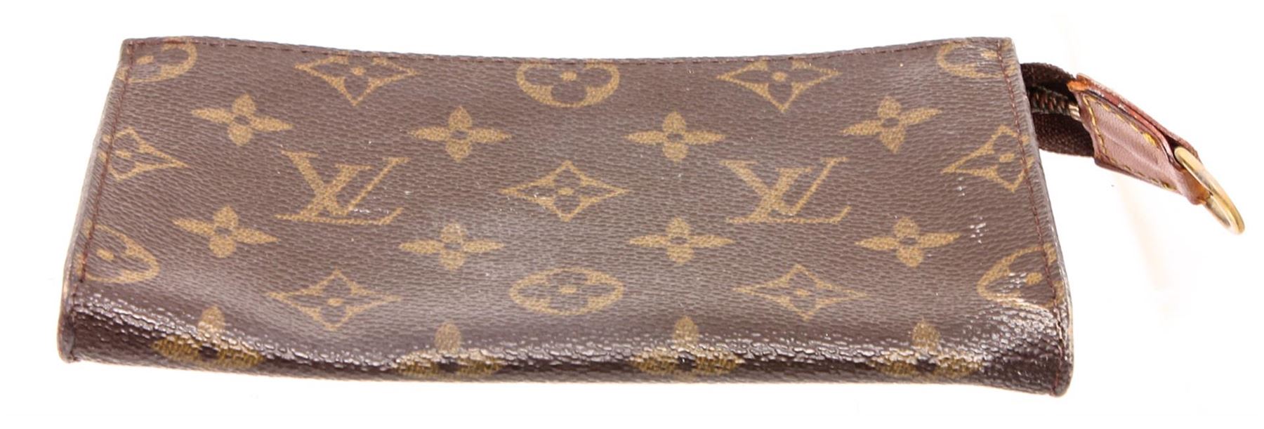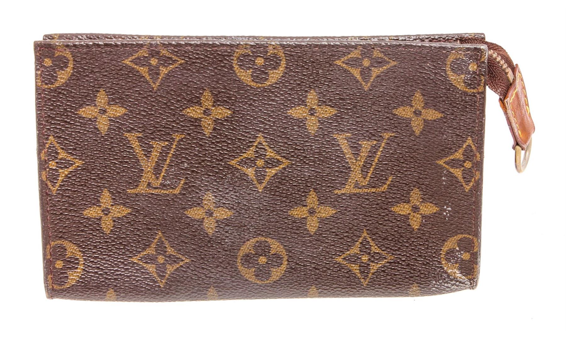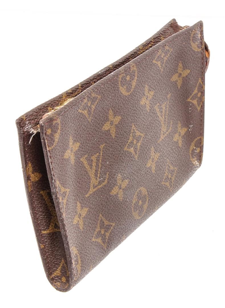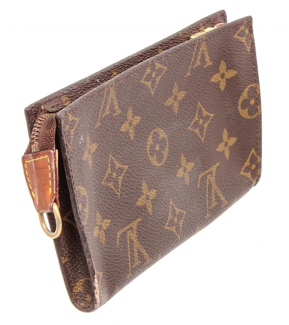 Brown and tan monogram coated canvas Louis Vuitton Toiletry Pouch 15 with brass hardware, brown Vachetta leather trim, beige coated canvas lining and zip closure at top.