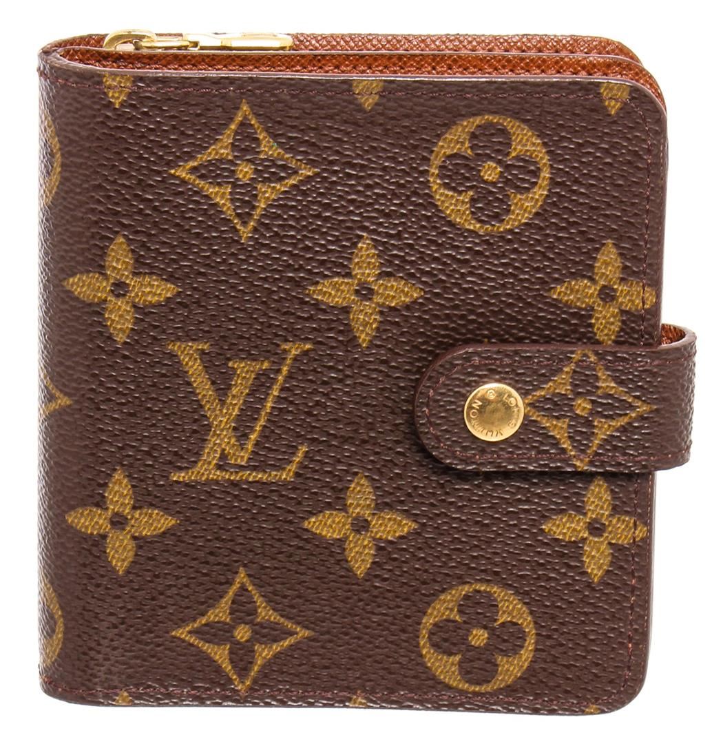 Brown and tan monogram coated canvas Louis Vuitton Porte-Papier Zippé wallet with gold-tone hardware, brown Taiga leather lining, single bill compartment, three card slots, two side pockets, snap closure, and zip pocket with two compartments.