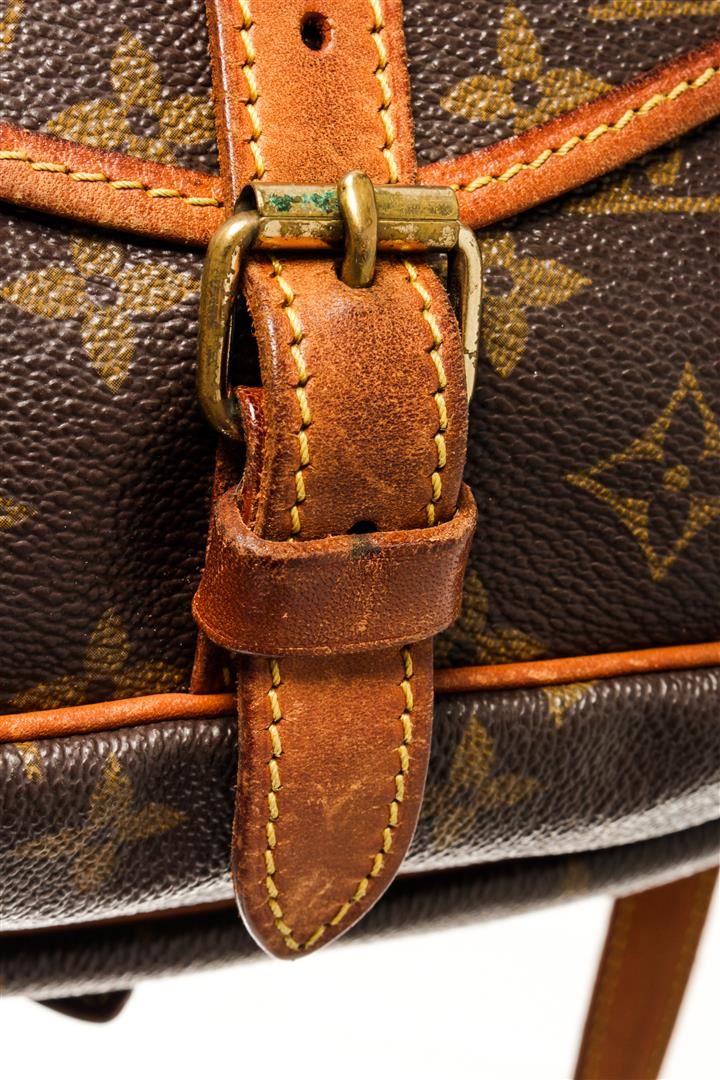 One Louis Vuitton Monogram Saumur 30. Item is sold AS-IS. All available information is listed in the description and shown in the photo. Louis Vuitton Monogram Saumur 30 with coated canvas exterior, brown fabric lining, contrasting vachetta leather trims and adjustable strap, flap and buckle closure, gold-tone hardware, and two main compartments, one on each side.