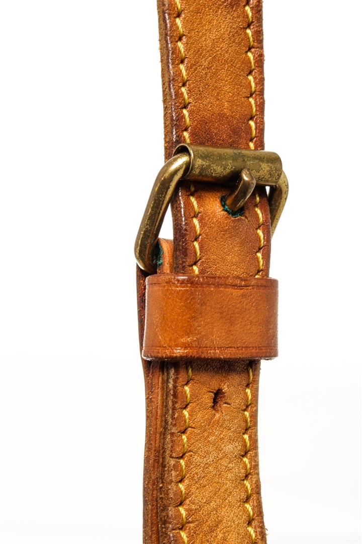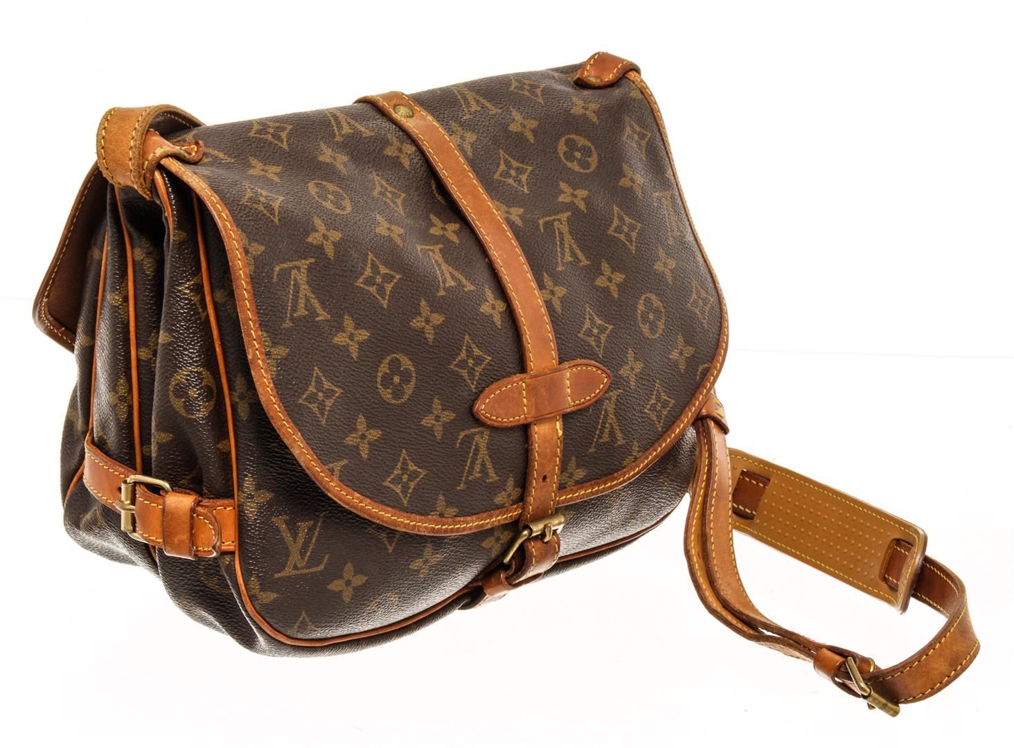 One Louis Vuitton Monogram Saumur 30. Item is sold AS-IS. All available information is listed in the description and shown in the photo. Louis Vuitton Monogram Saumur 30 with coated canvas exterior, brown fabric lining, contrasting vachetta leather trims and adjustable strap, flap and buckle closure, gold-tone hardware, and two main compartments, one on each side.