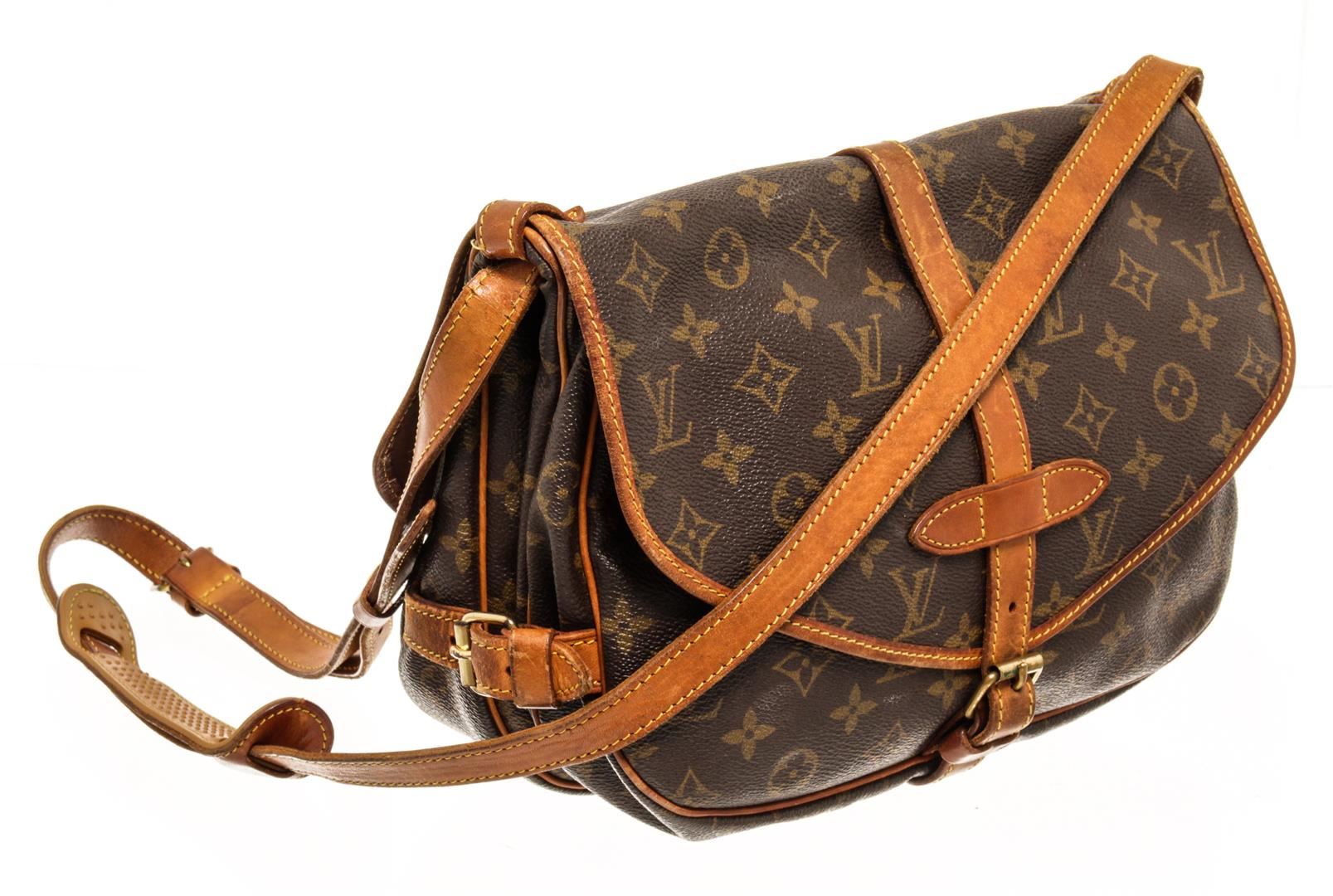 One Louis Vuitton Monogram Saumur 30. Item is sold AS-IS. All available information is listed in the description and shown in the photo. Louis Vuitton Monogram Saumur 30 with coated canvas exterior, brown fabric lining, contrasting vachetta leather trims and adjustable strap, flap and buckle closure, gold-tone hardware, and two main compartments, one on each side.
