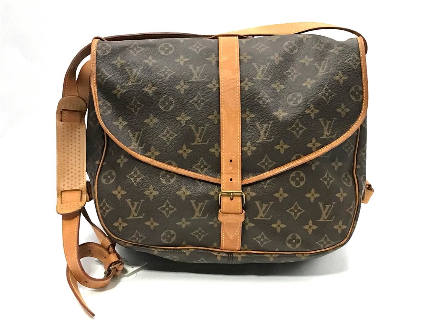One Louis Vuitton Monogram Saumur 35. Item is sold AS-IS. All available information is listed in the description and shown in the photo. Louis Vuitton Monogram Saumur 35 with coated canvas exterior, brown fabric lining, contrasting vachetta leather trims and adjustable strap, gold-tone hardware, flap and buckle closure, and two main compartments, one on each side.