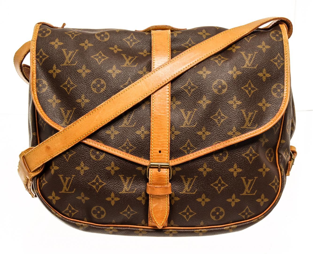 One Louis Vuitton Monogram Saumur 35. Item is sold AS-IS. All available information is listed in the description and shown in the photo. Louis Vuitton Monogram Saumur 35 handbag with coated canvas exterior, brown fabric lining, gold-hardware, contrasting vachetta leather trims and adjustable straps, flap and buckle closure, and two main compartments on each side.