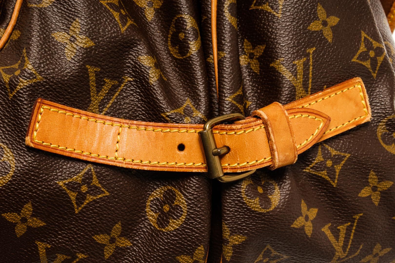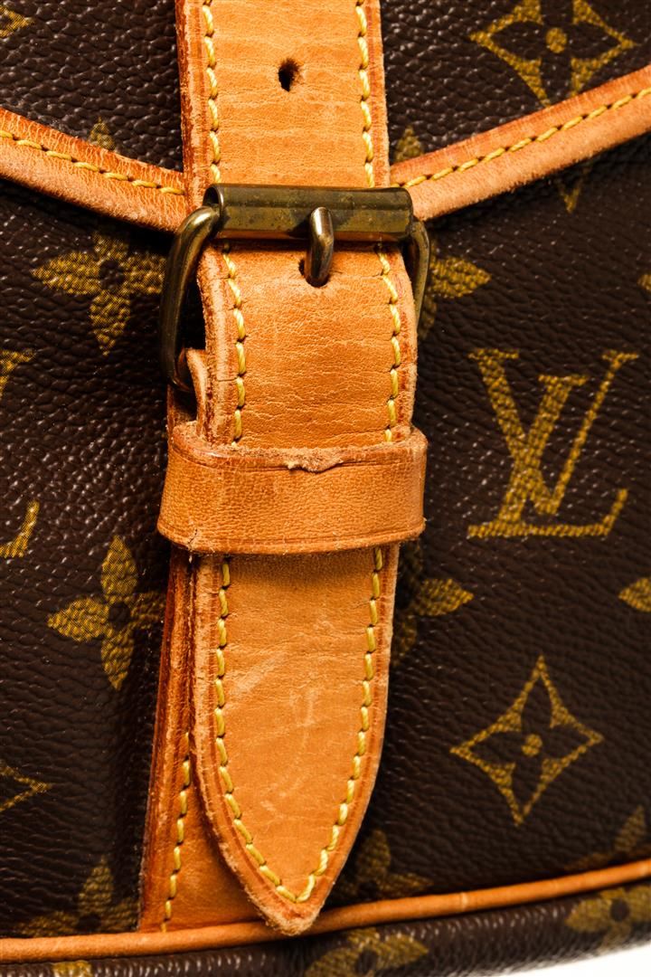 One Louis Vuitton Monogram Saumur 35. Item is sold AS-IS. All available information is listed in the description and shown in the photo. Louis Vuitton Monogram Saumur 35 handbag with coated canvas exterior, brown fabric lining, gold-hardware, contrasting vachetta leather trims and adjustable straps, flap and buckle closure, and two main compartments on each side.