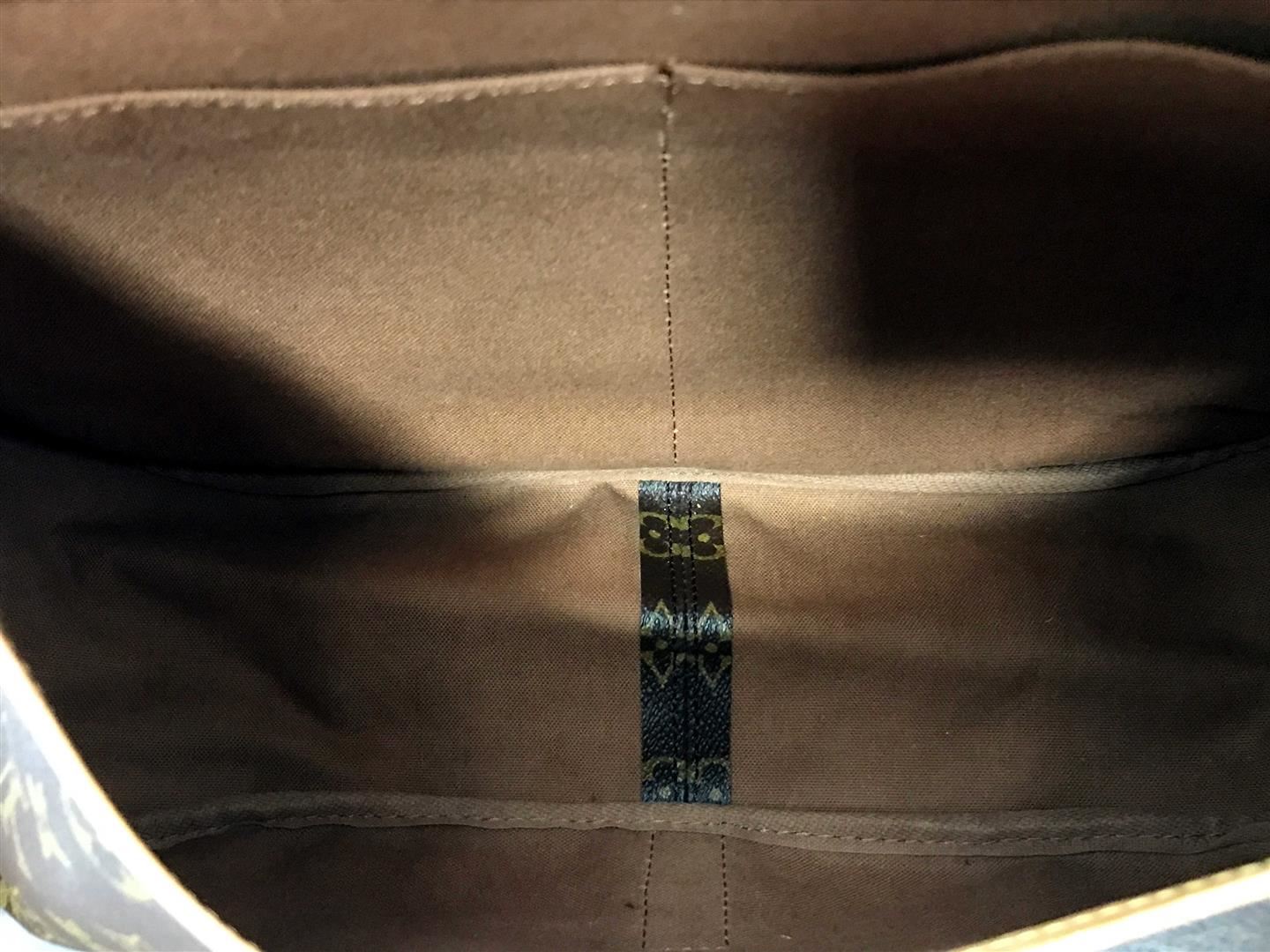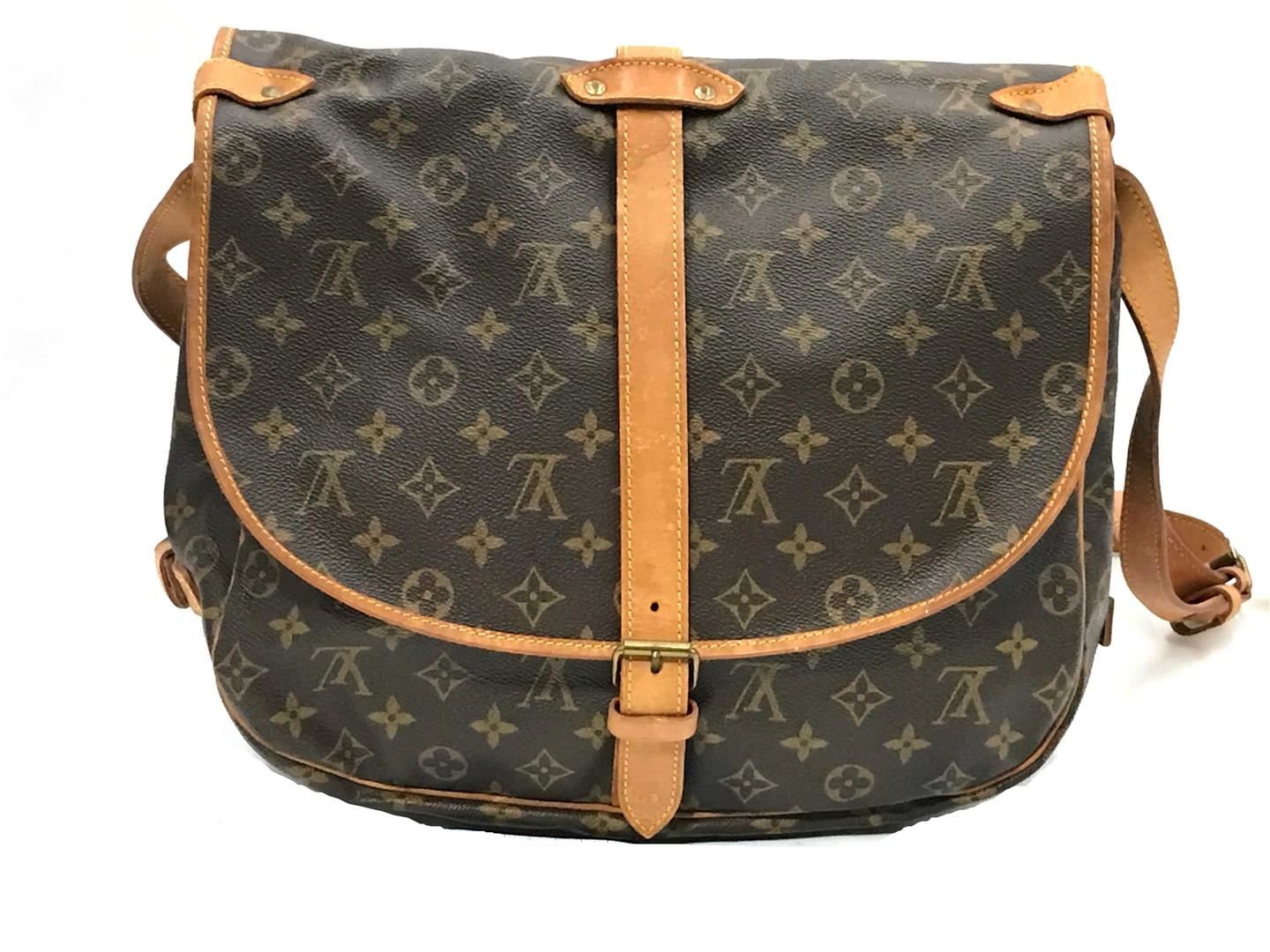 One Louis Vuitton Monogram Saumur 35. Item is sold AS-IS. All available information is listed in the description and shown in the photo. Louis Vuitton Monogram Saumur 35 with coated canvas exterior, brown fabric lining, contrasting vachetta leather trims and adjustable strap, gold-tone hardware, flap and buckle closure, and two main compartments, one on each side.
