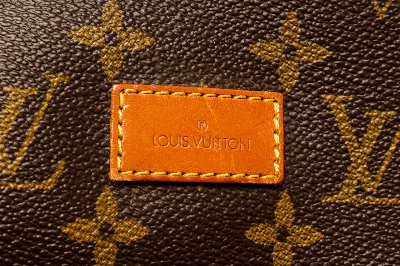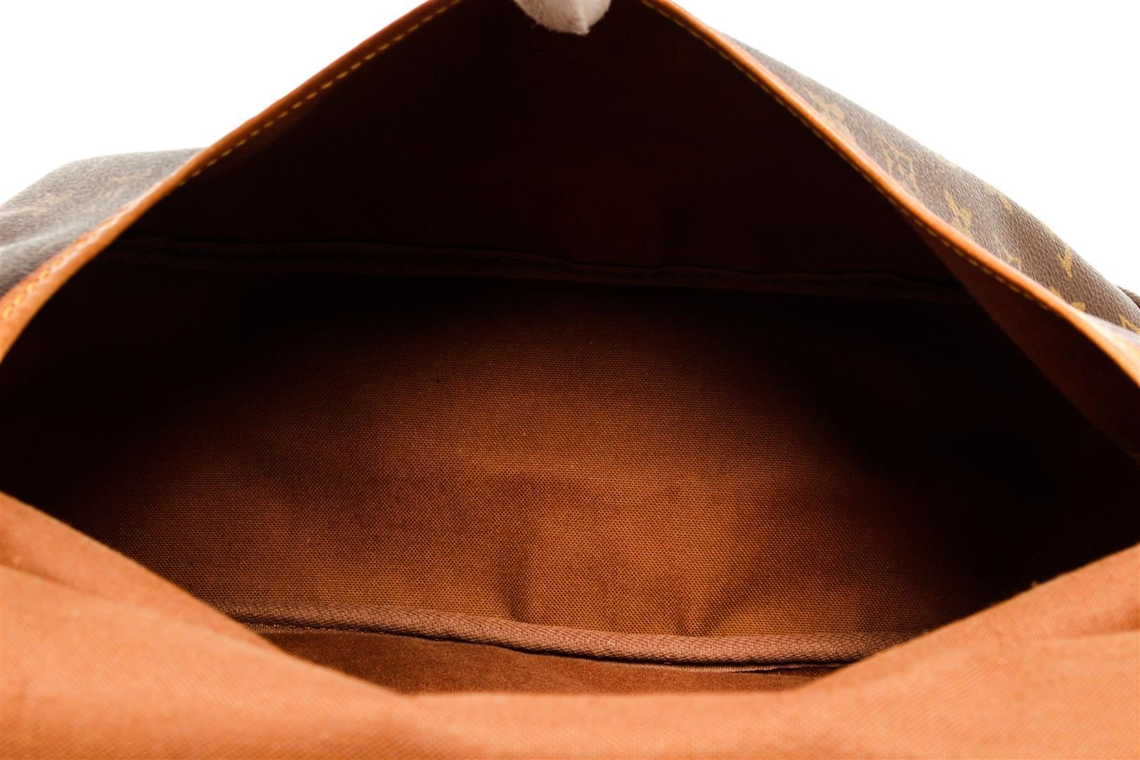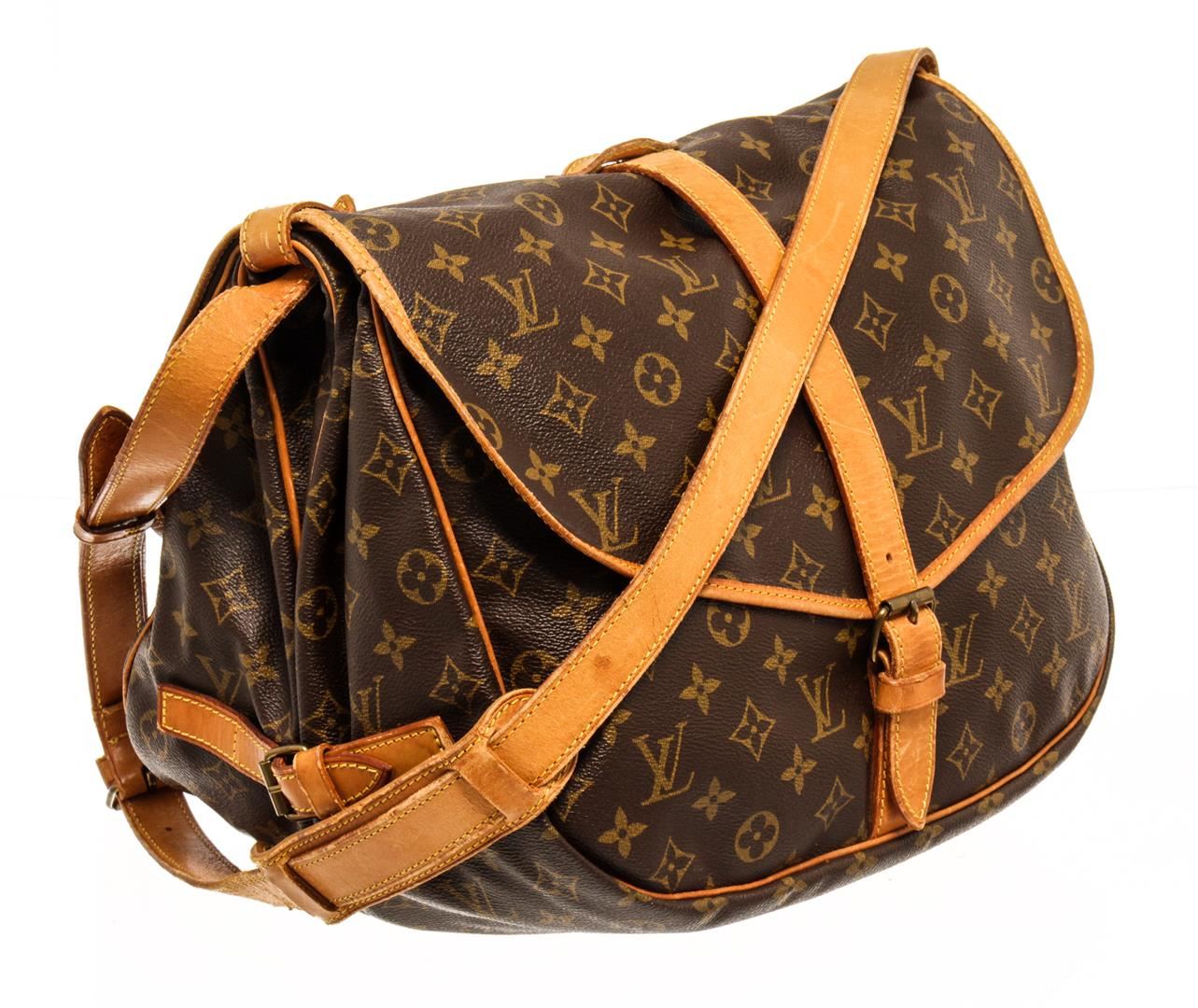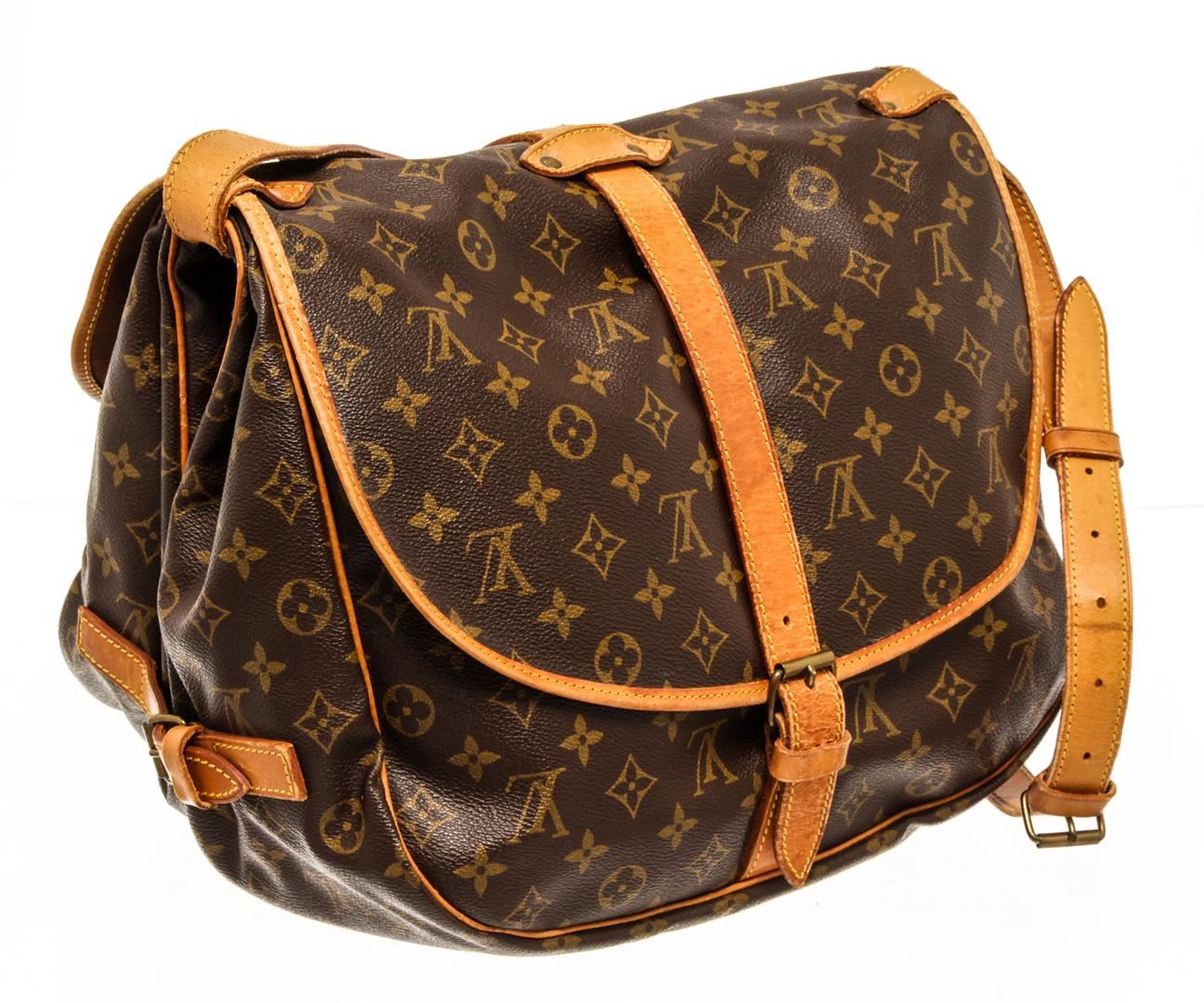 One Louis Vuitton Monogram Saumur 35. Item is sold AS-IS. All available information is listed in the description and shown in the photo. Louis Vuitton Monogram Saumur 35 handbag with coated canvas exterior, brown fabric lining, gold-hardware, contrasting vachetta leather trims and adjustable straps, flap and buckle closure, and two main compartments on each side.