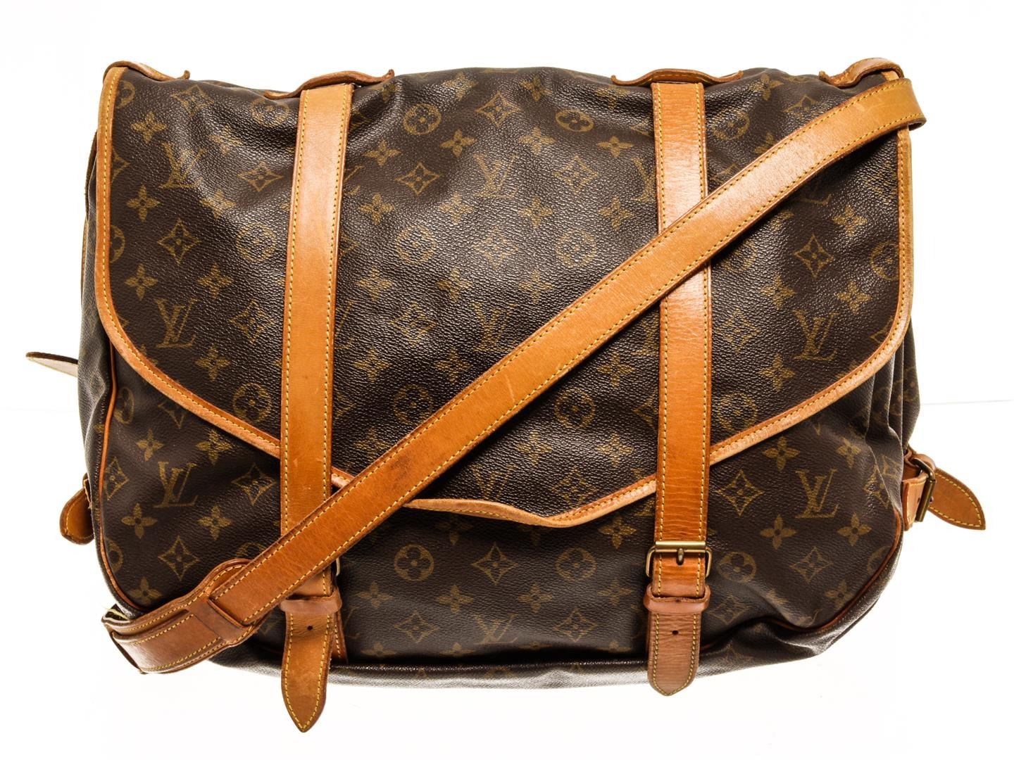 One Louis Vuitton Monogram Saumur 43 Shoulder Bag. Item is sold AS-IS. All available information is listed in the description and shown in the photo. Louis Vuitton Monogram Saumur 43 shoulder bag with coated canvas exterior, brown fabric lining, contrasting vachetta leather trims and adjustable strap; gold-tone hardware, flap and buckle closure; and two main compartments, one on each side.