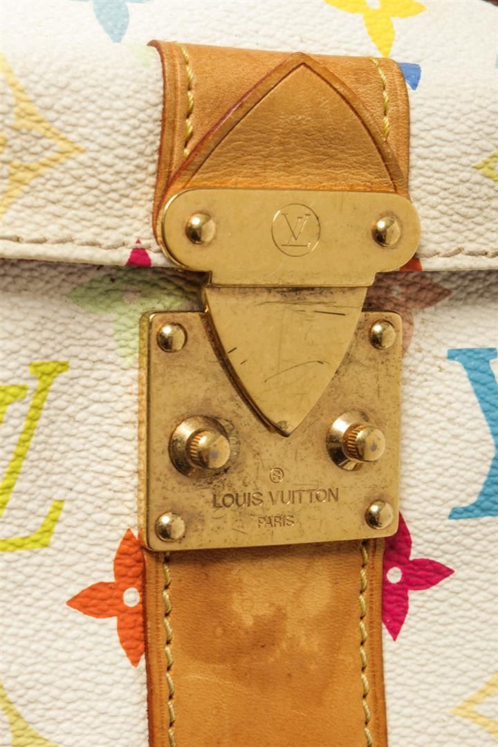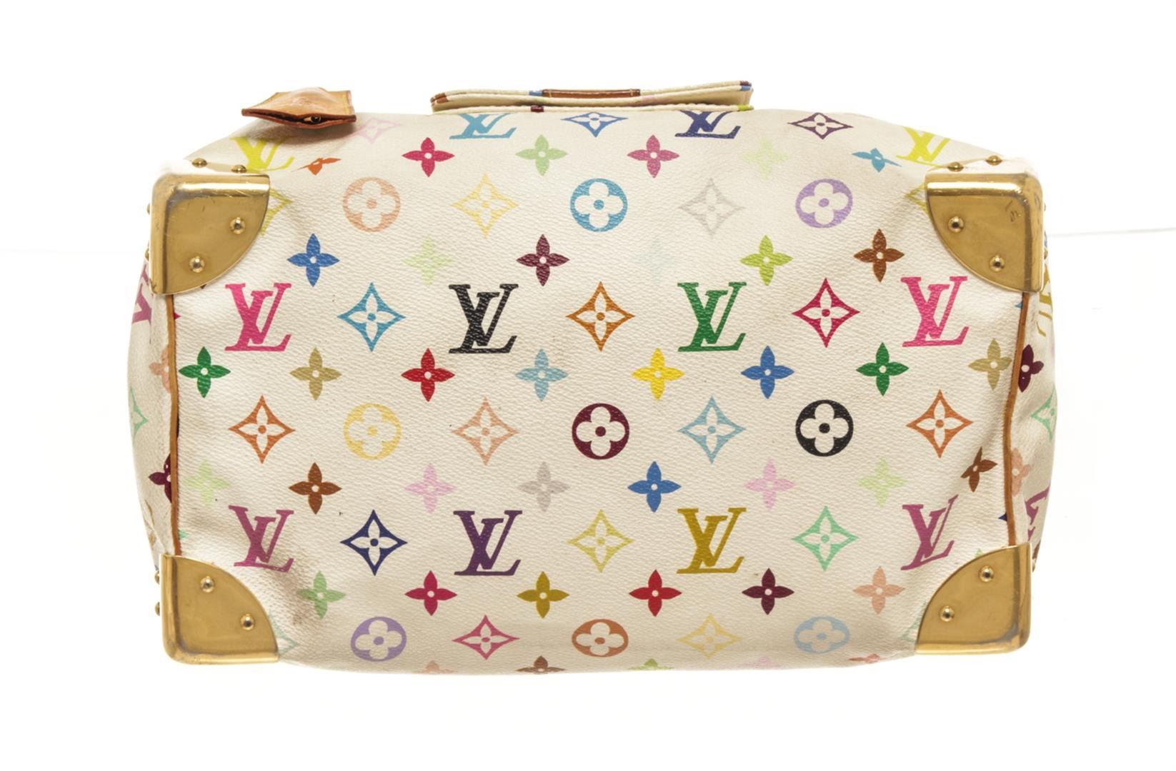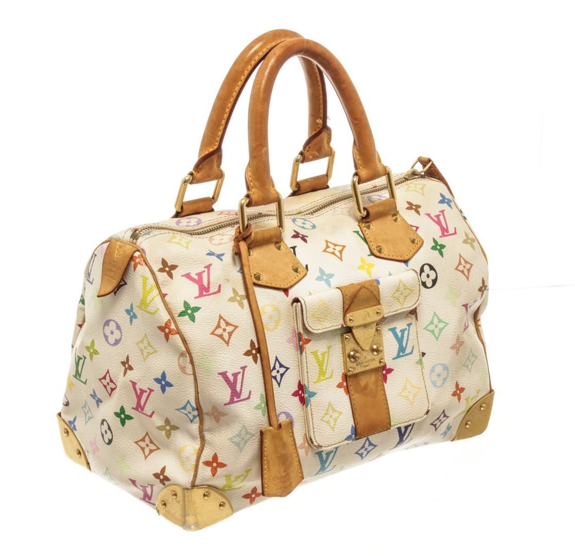 One Louis Vuitton Multicolor White Calf Leather Speedy 30 Handbag. Item is sold AS-IS. All available information is listed in the description and shown in the photo. Louis Vuitton Multicolor White Calf Leather Speedy 30 Handbag with louis vuitton for everyday use. white in color the bag is crafted from louis vuitton's multicolor monogram canvas. it has gold tone hardware and enough room to hold your everyday essentials. speedy is a bag that can be worn on any occasion. White on bag is worn and discolored, vachetta is stained, hardware is scratched. Please refer to photos.