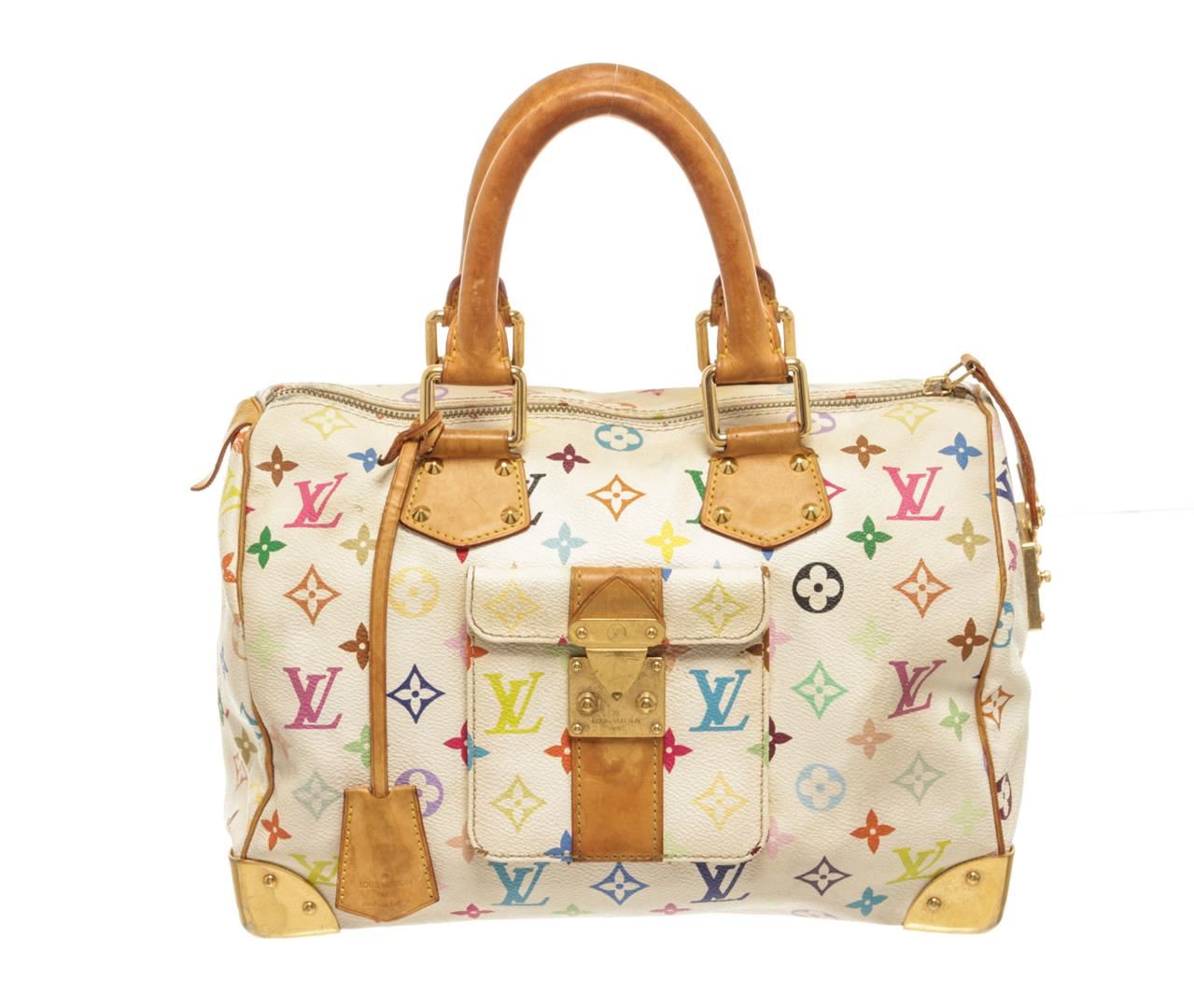 One Louis Vuitton Multicolor White Calf Leather Speedy 30 Handbag. Item is sold AS-IS. All available information is listed in the description and shown in the photo. Louis Vuitton Multicolor White Calf Leather Speedy 30 Handbag with louis vuitton for everyday use. white in color the bag is crafted from louis vuitton's multicolor monogram canvas. it has gold tone hardware and enough room to hold your everyday essentials. speedy is a bag that can be worn on any occasion. White on bag is worn and discolored, vachetta is stained, hardware is scratched. Please refer to photos.