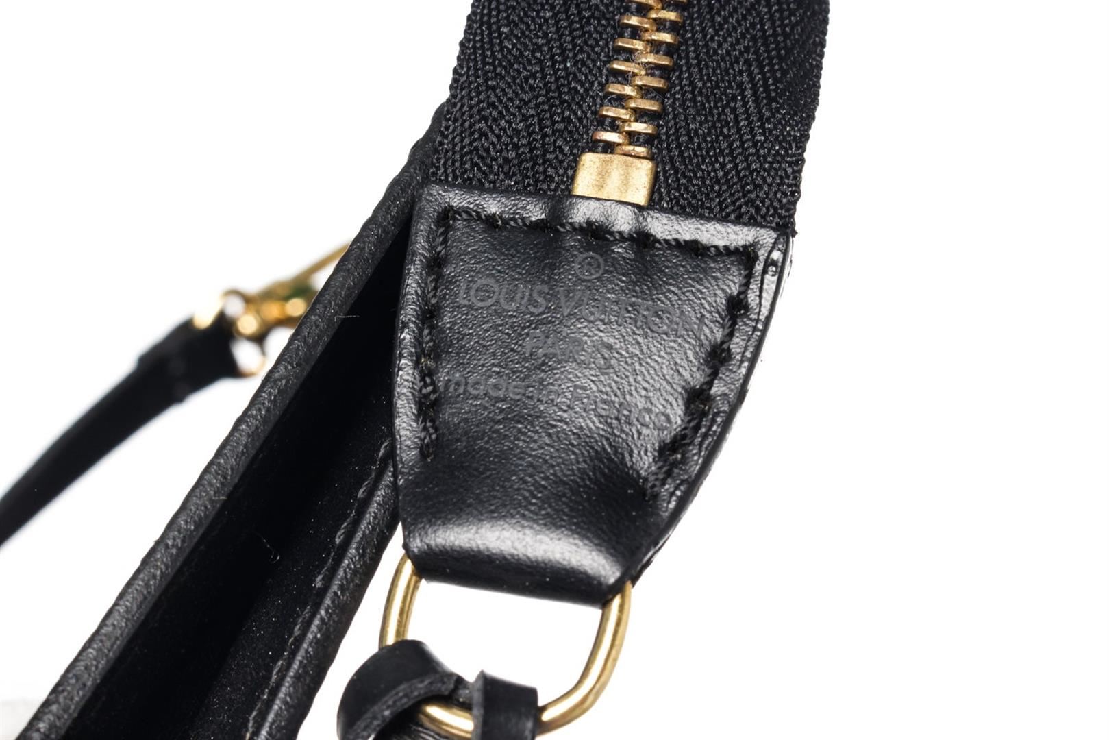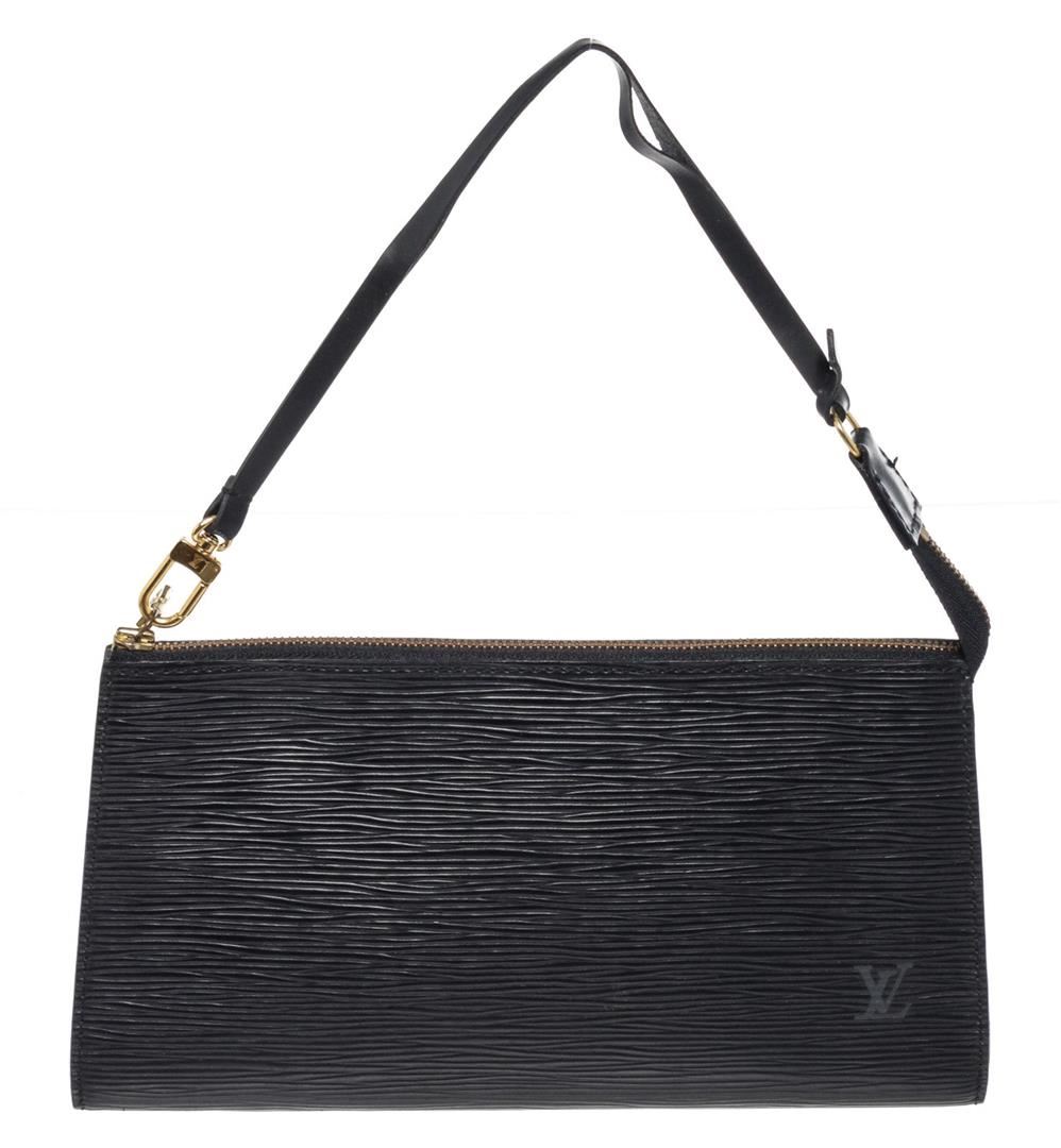 Louis Vuitton Navy Epi Leather Pochette Accessories Shoulder Bag with epi leather, silver-tone hardware, trim tan vachetta leather, top handle, zipper closure.