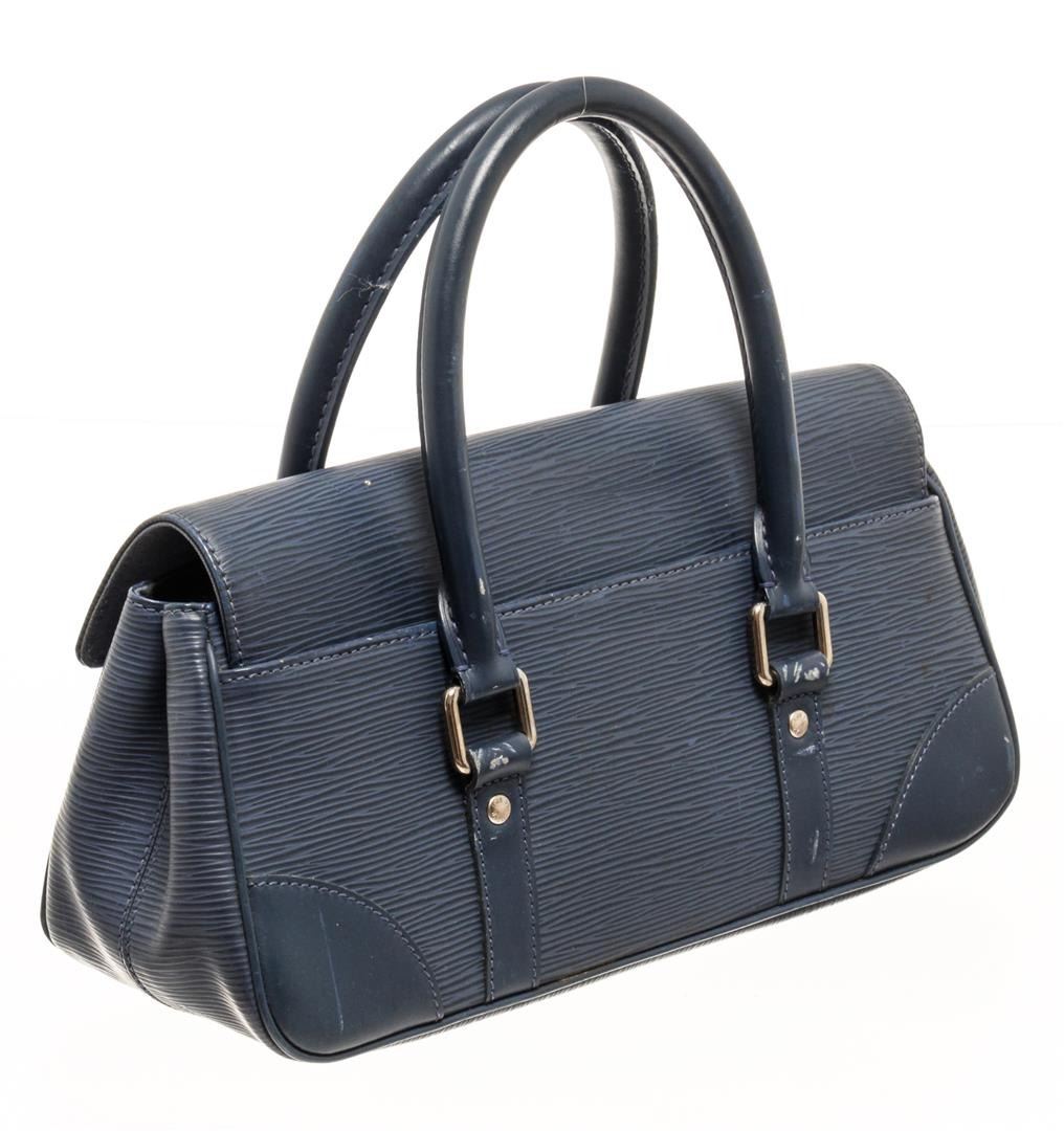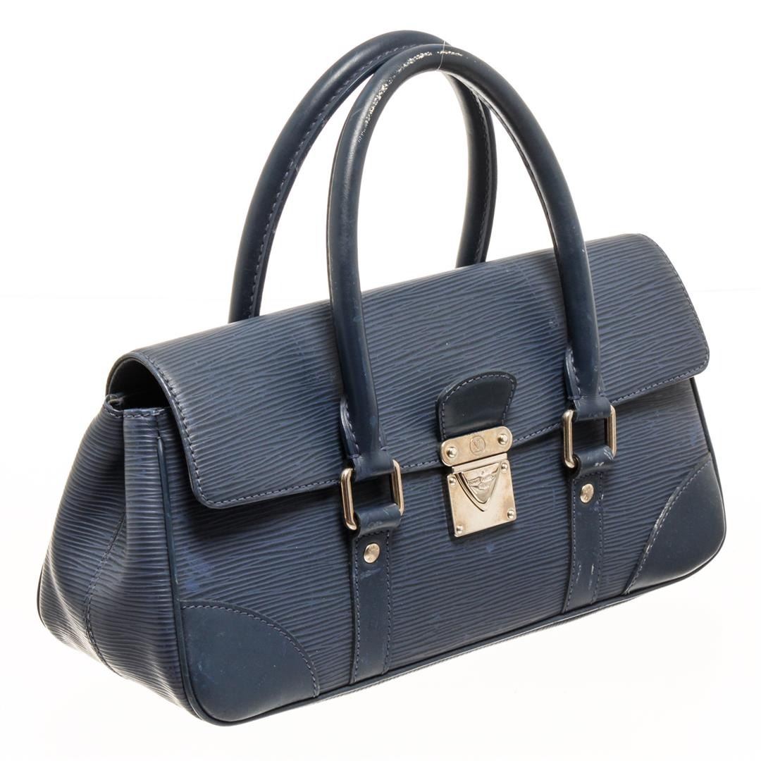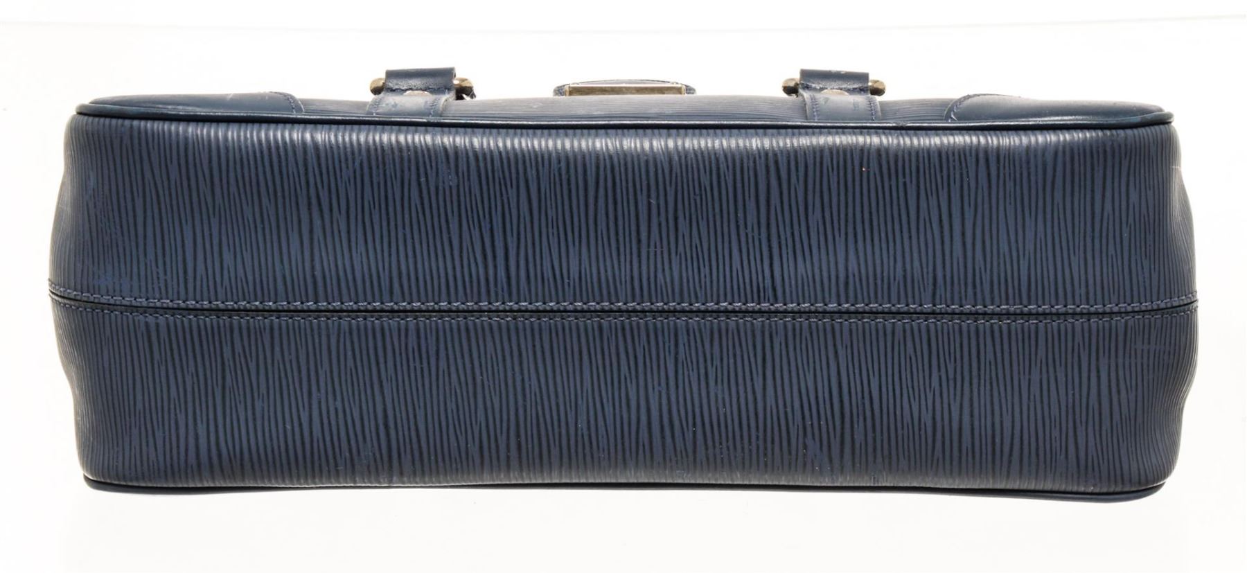 One Louis Vuitton Navy Epi Leather Segur PM Bag. Item is sold AS-IS. All available information is listed in the description and shown in the photo. Louis Vuitton navy epi leather Segur PM bag with leather exterior, blue fabric lining, silver-toned hardware, flap and lock closure, two rigid top handles, and one interior slip pocket. The PM size is the smallest size of the Segur family. There are some spots and repainting on the handle & exterior as shown in photos.   Height: 6.7" Width: 3.94" Depth: 11.82" , Handle Drop: / 17 x 10 x 30 Cm