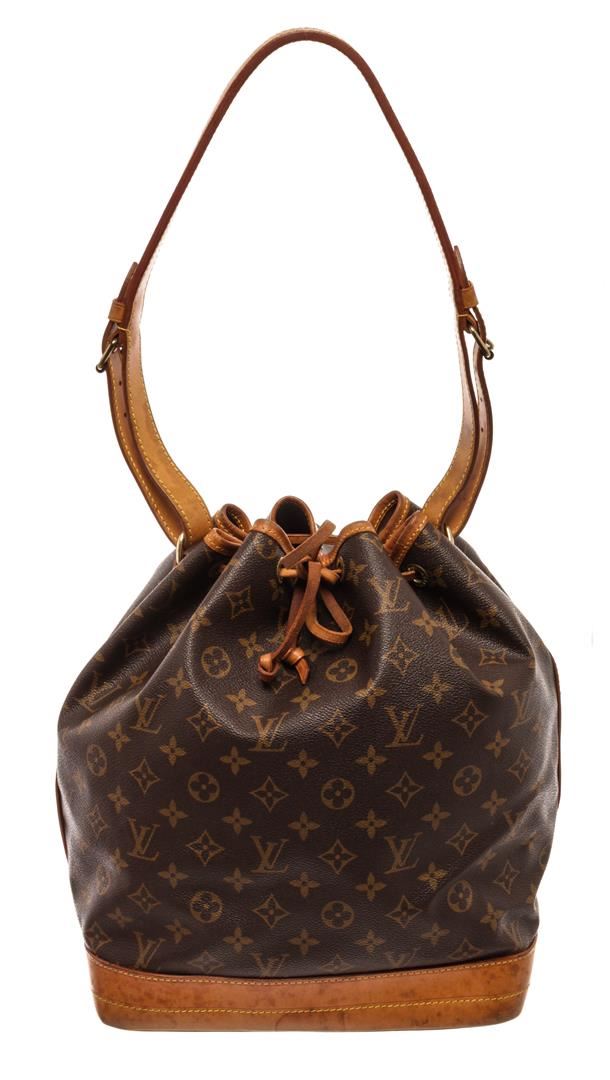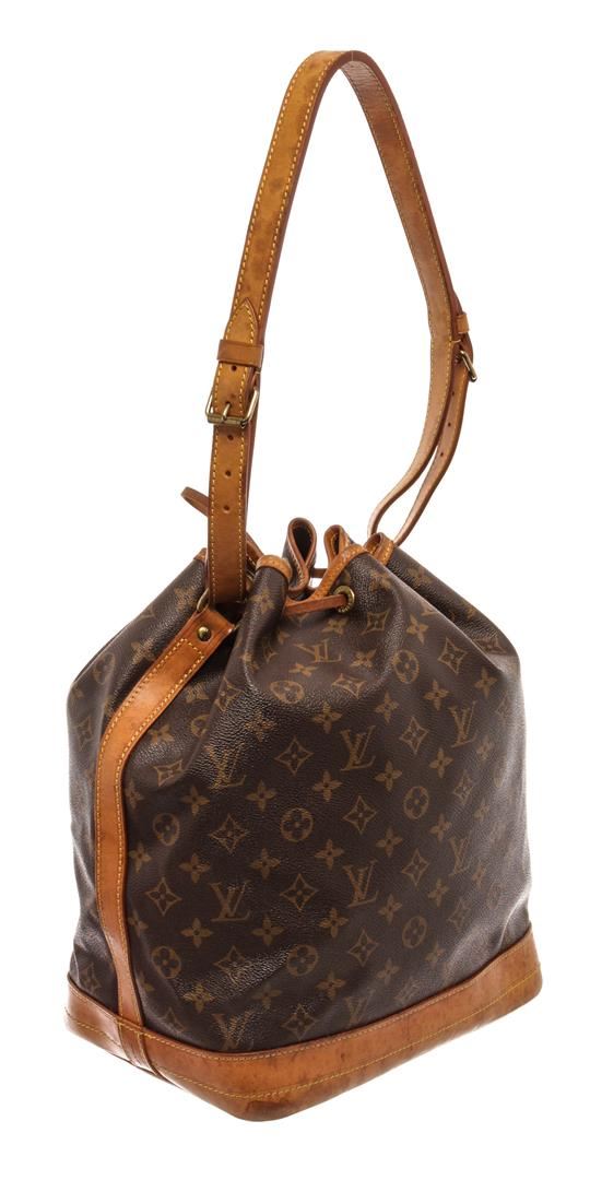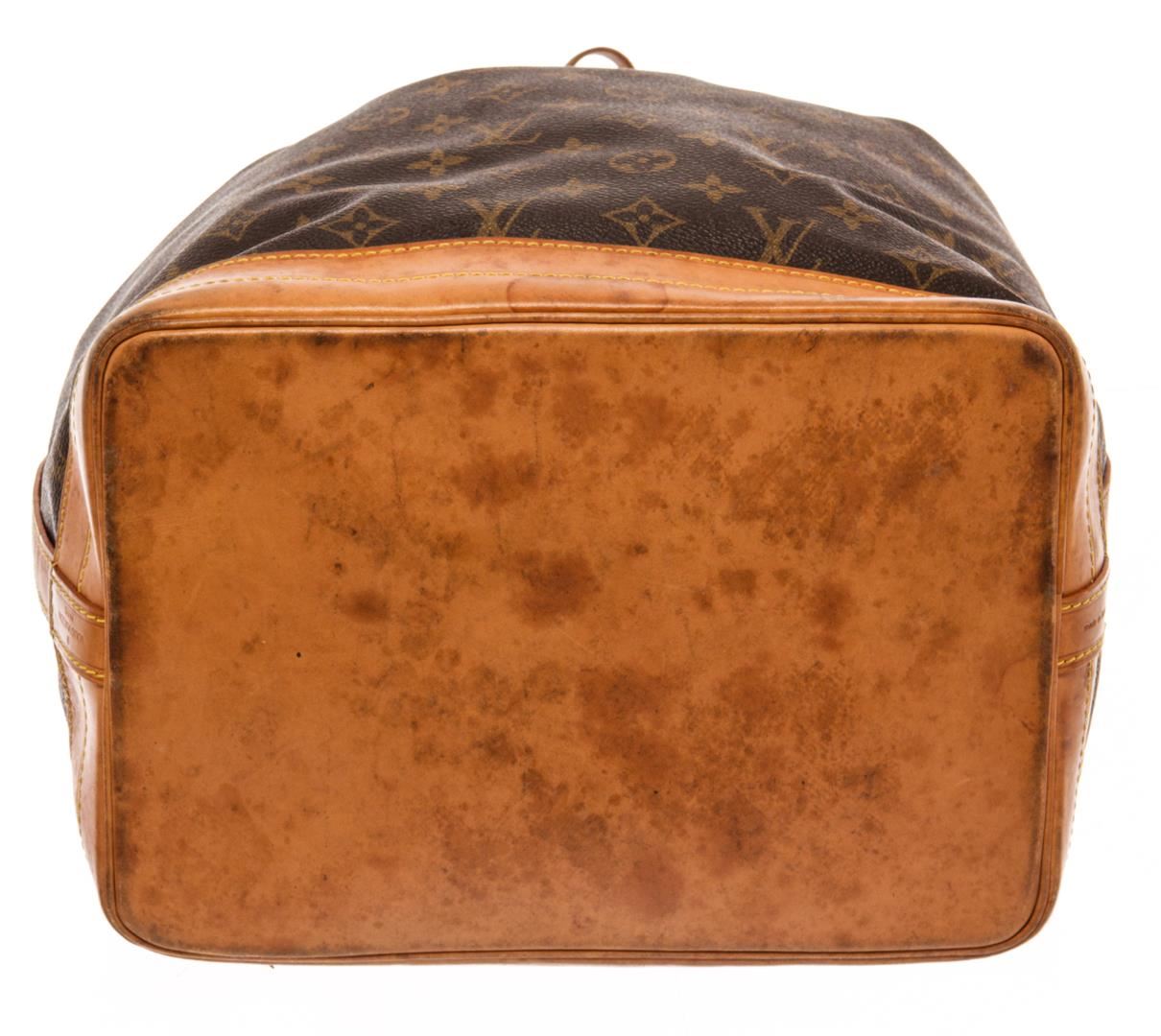 Louis Vuitton Noe GM Bucket Bag brown monogram canvas. Brand: Louis Vuitton, Style: Noe GM, Type: Bucket Bag, Exterior Color: brown monogram, Exterior Material: canvas, Exterior Pockets: None, Interior Color: brown, tan, Interior Material: canvas, Interior Pockets: none, Closure: leather pull, Handle/Strap Type: leather shoulder strap, Length: 1N/A 1/2, Width: 7 1/4, Height: 13 1/2, Strap Drop: 11. Condition: wear on leather, water damage?. Item is sold AS-IS and all information pertaining to this lot is available in the photos or this description.