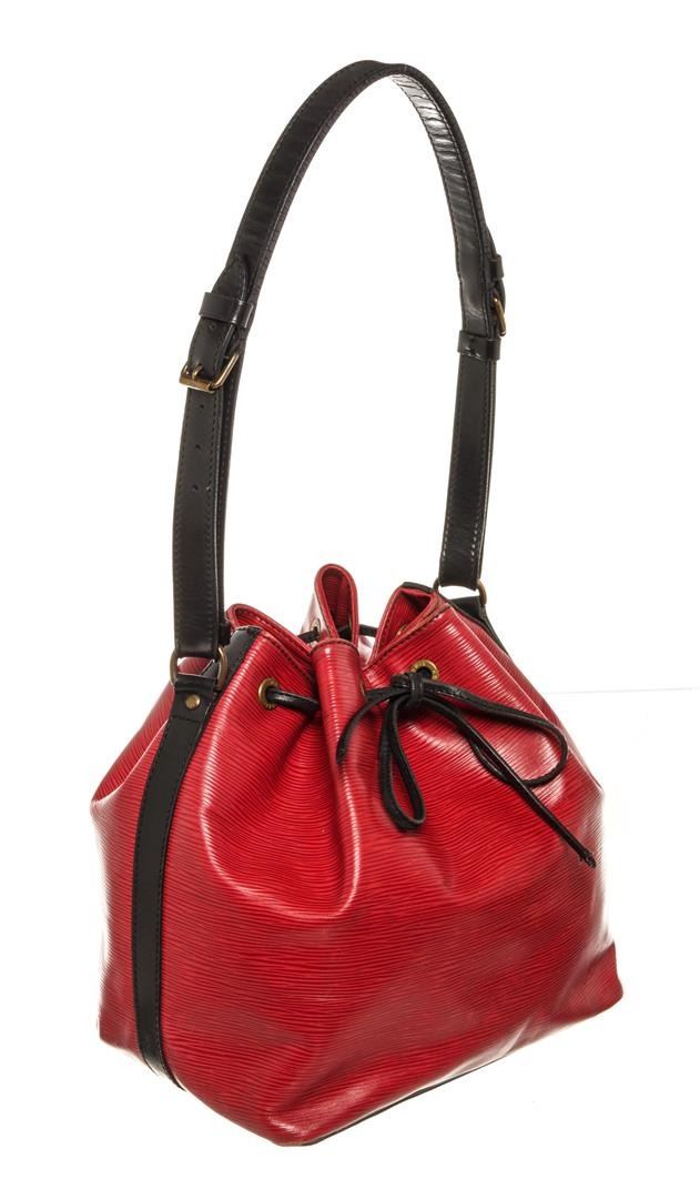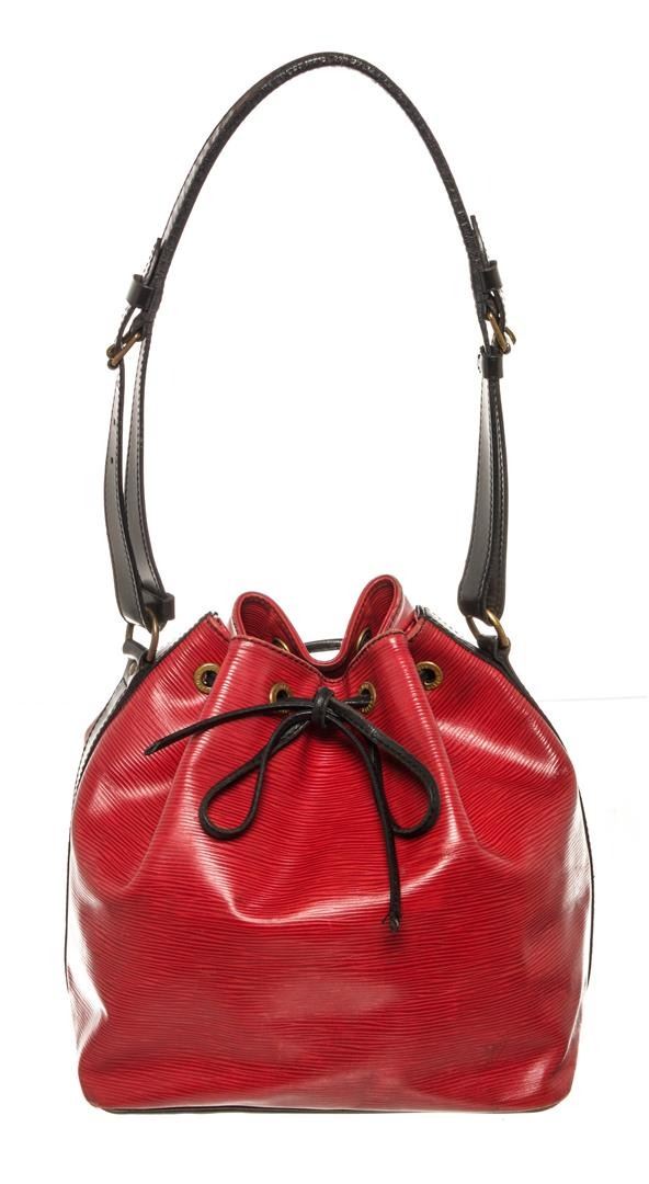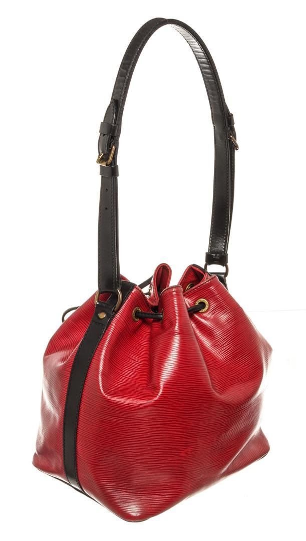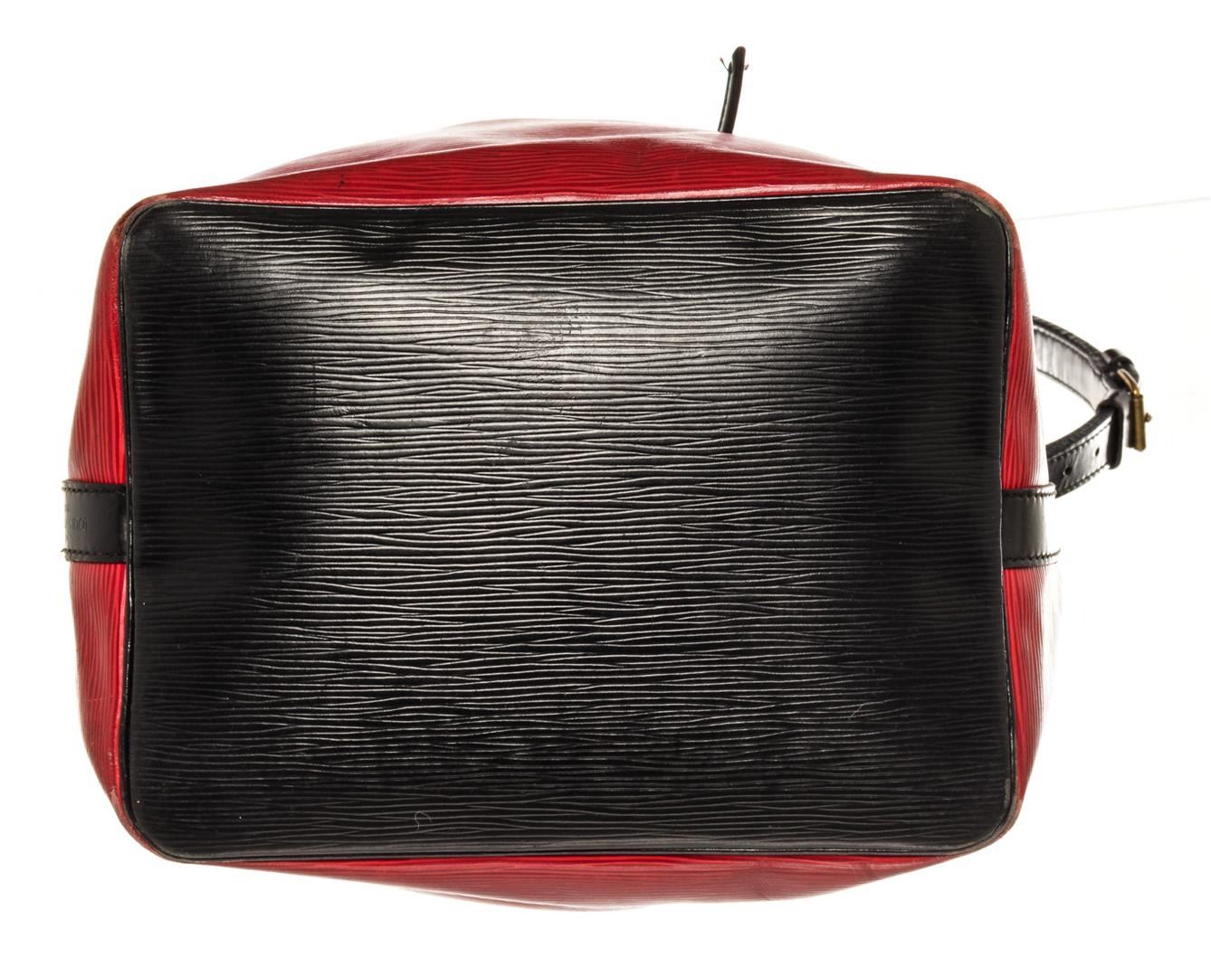 Louis Vuitton Noe Shoulder Bag Red Black Epi Leather. Brand: Louis Vuitton, Style: Noe, Type: Shoulder Bag, Exterior Color: Red Black, Exterior Material: Epi Leather, Interior Color: Black, Interior Material: Alcantara, Interior Pockets: One Zip, Closure: Drawstring, Handle/Strap Type: Adjustable Shoulder Strap, Length: 1N/A", Width: 7.5", Height: 1N/A.5", Strap Drop: 12". Condition: Corner/edge wear, some tearing near interior zipper pocket. Additional Information: Gold Hardware. Item is sold AS-IS and all information pertaining to this lot is available in the photos or this description.