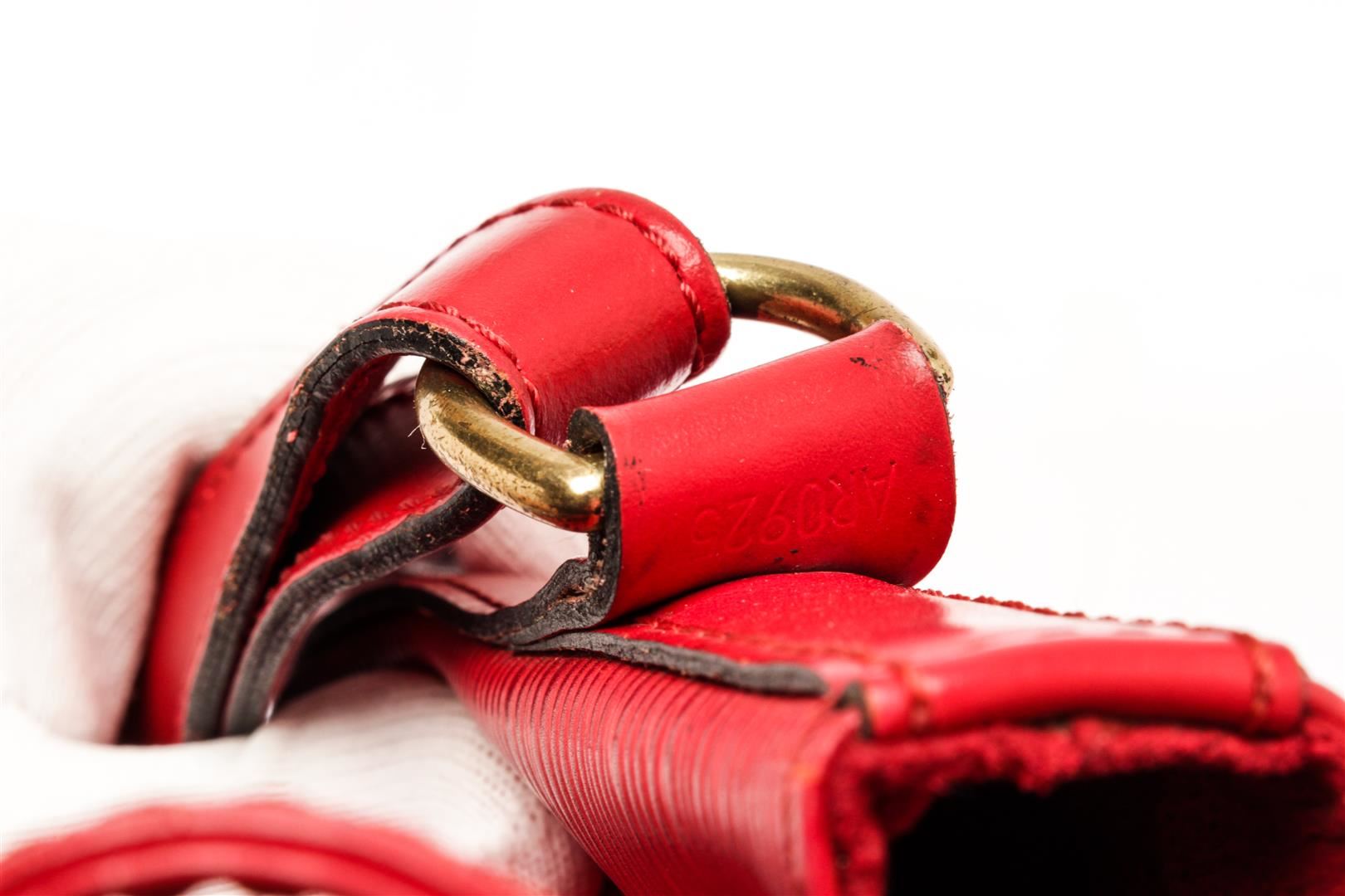 Louis Vuitton Noe Shoulder Bag. Brand: Louis Vuitton, Style: Noe, Type: Shoulder Bag, Exterior color: Castilian Red, Exterior material: Epi Leather, Interior color: Red, Interior material: Alcantara, Length: 10", Width: 7.5", Height: 10.5". Item is sold A