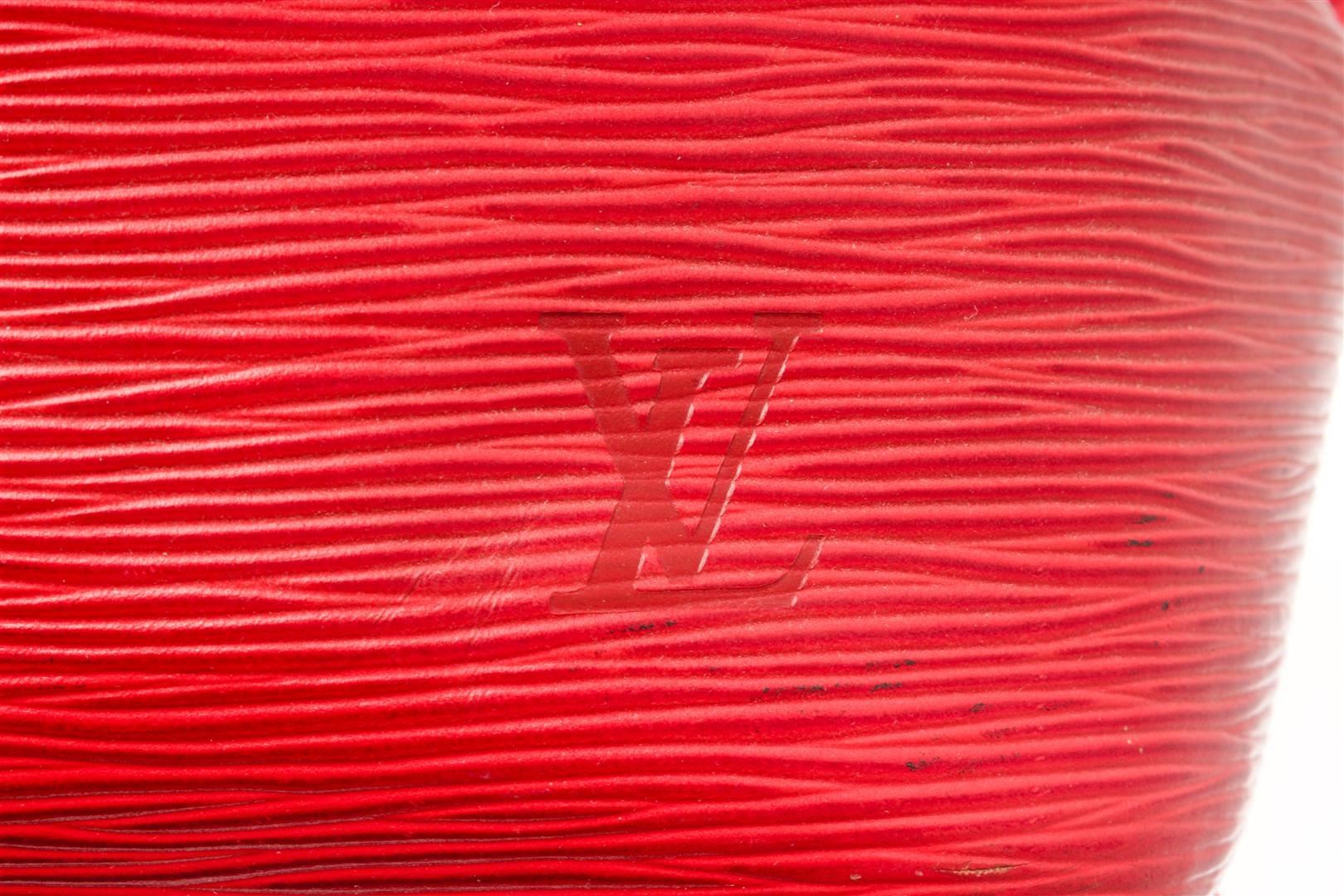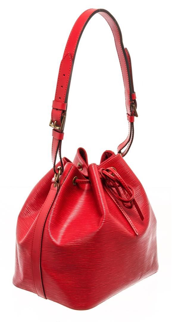 Louis Vuitton Petit Noe Shoulder Bag Castilian Red Epi Leather. Brand: Louis Vuitton, Style: Petit Noe, Type: Shoulder Bag, Exterior Color: Castilian Red, Exterior Material: Epi Leather, Interior Color: Red, Interior Material: Alcantara, Closure: Drawstring, Handle/Strap Type: Adjustable Shoulder Strap, Length: 1N/A", Width: 7.5", Height: 1N/A.5", Strap Drop: 12". Condition: Light corner wear. Additional Information: Gold Hardware. Item is sold AS-IS and all information pertaining to this lot is available in the photos or this description.