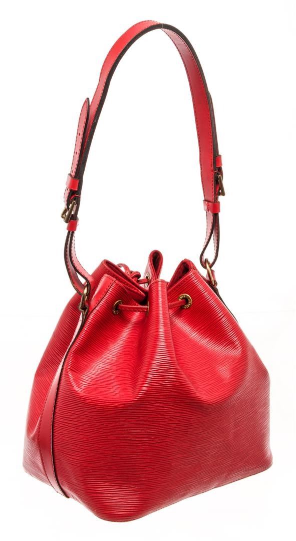 Louis Vuitton Petit Noe Shoulder Bag Castilian Red Epi Leather. Brand: Louis Vuitton, Style: Petit Noe, Type: Shoulder Bag, Exterior Color: Castilian Red, Exterior Material: Epi Leather, Interior Color: Red, Interior Material: Alcantara, Closure: Drawstring, Handle/Strap Type: Adjustable Shoulder Strap, Length: 1N/A", Width: 7.5", Height: 1N/A.5", Strap Drop: 12". Condition: Light corner wear. Additional Information: Gold Hardware. Item is sold AS-IS and all information pertaining to this lot is available in the photos or this description.