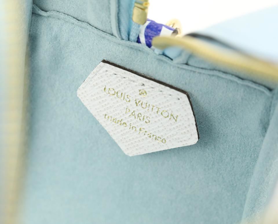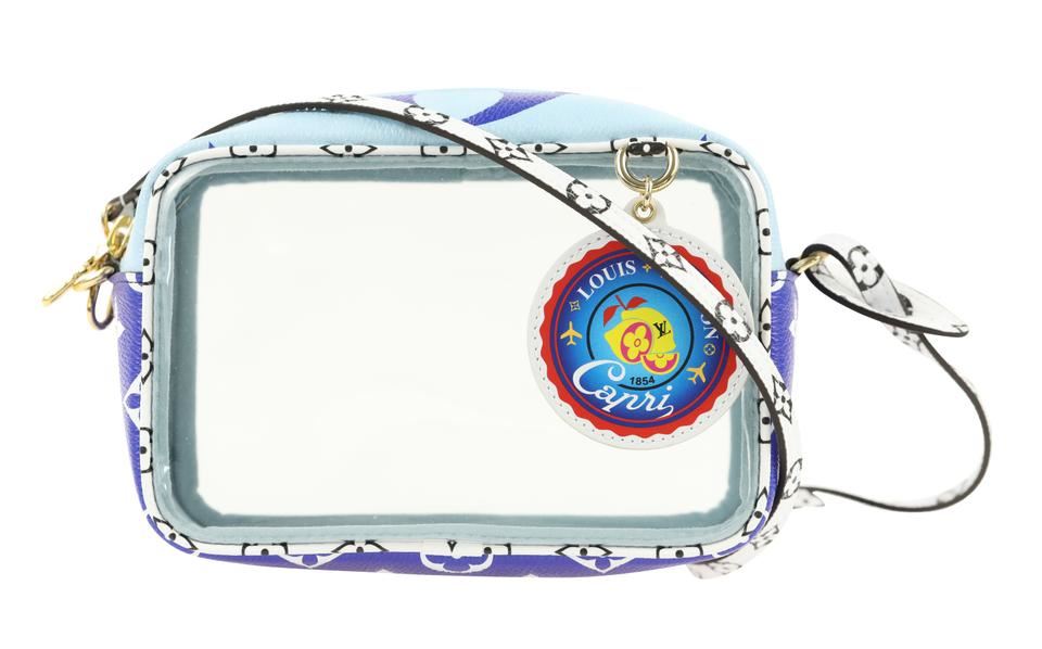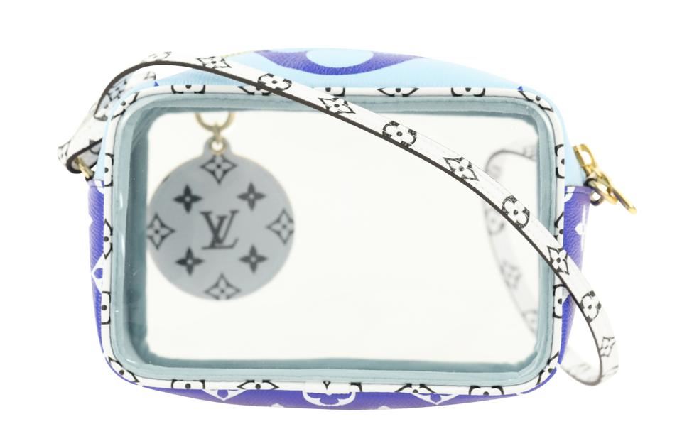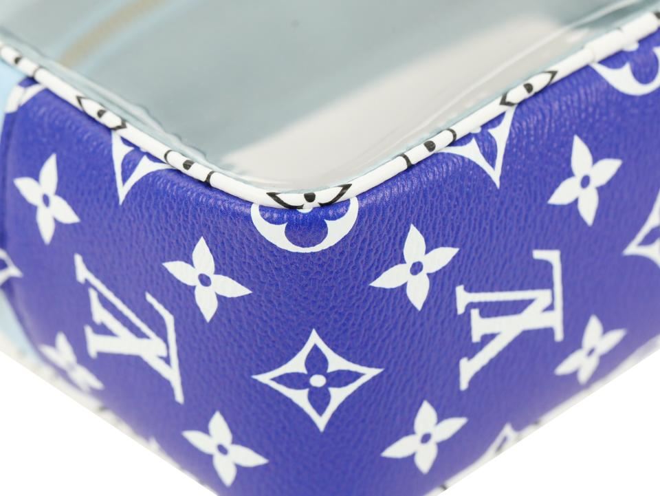 Louis Vuitton Monogram Beach Pouch Strap drop approx. 8.5" Single coated canvas strap that is removable It can be worn at the curve of the arm Length at longest point 6.5" Coated canvas Transparent PVC featured at the front and back Blue Structure of bag is hard- it can stand on its own Top zipper closure Gold-tone hardware Microfiber lined interior Made in France