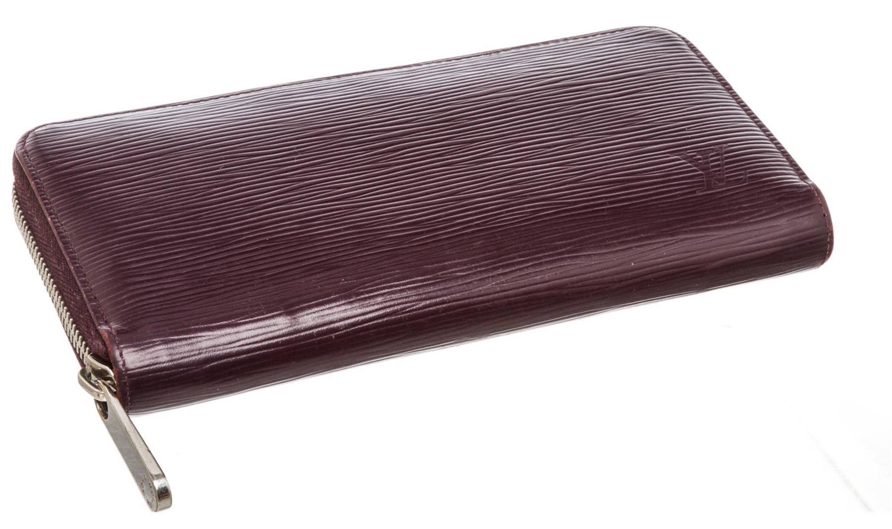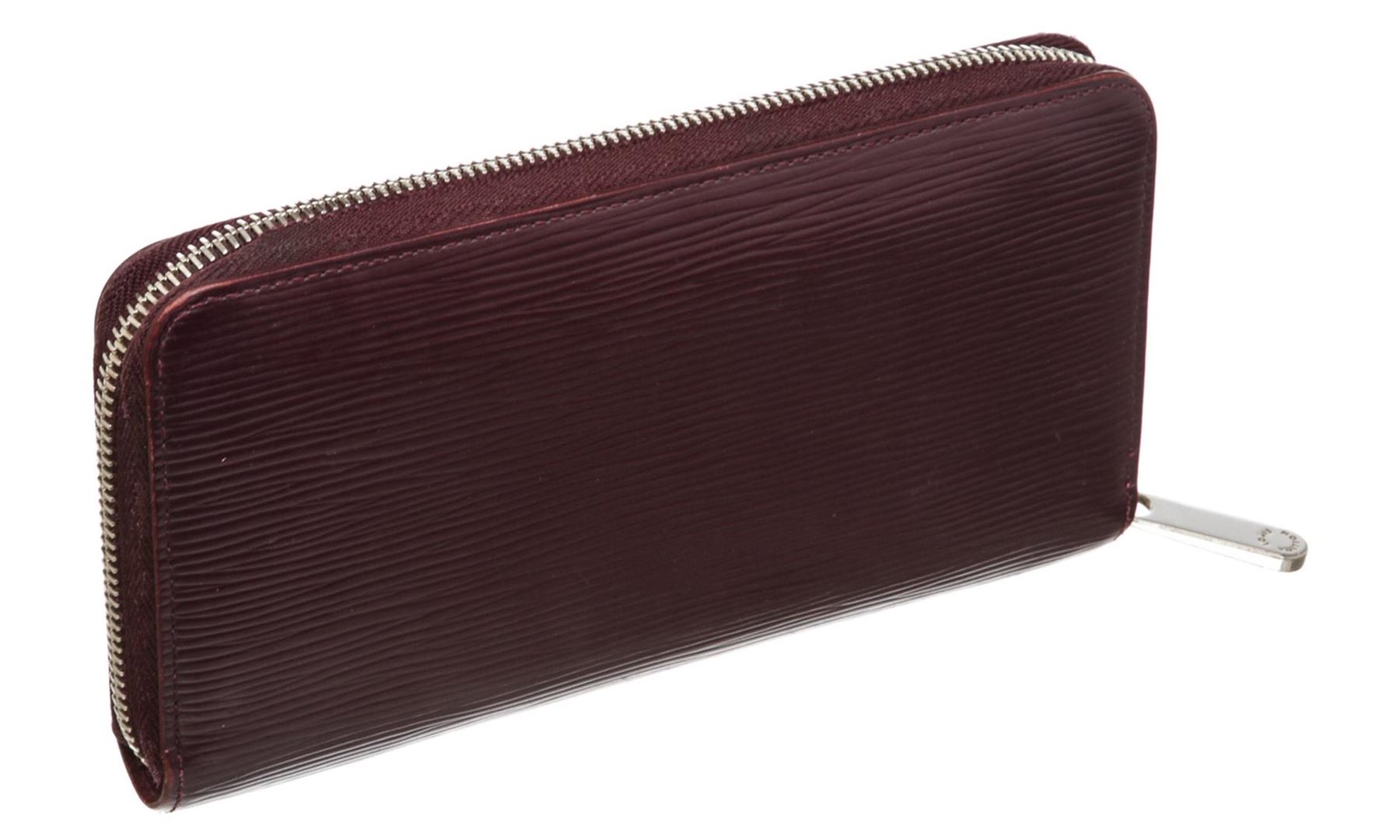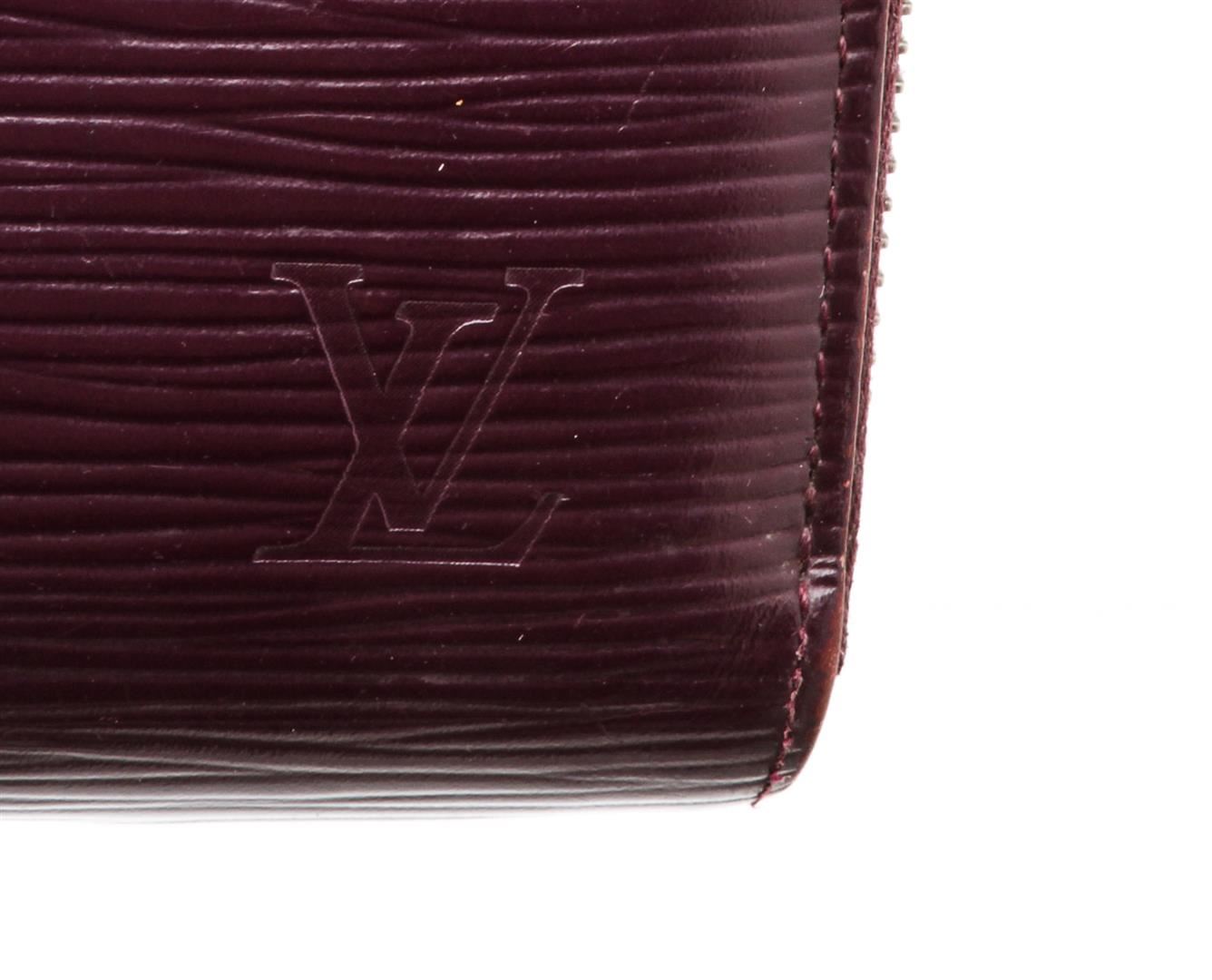 Purple Epi leather Louis Vuitton Zippy wallet with silver-tone hardware, tonal leather interior, five compartments; one with zip closure, dual bill compartments, eight card slots and zip-around closure at top.