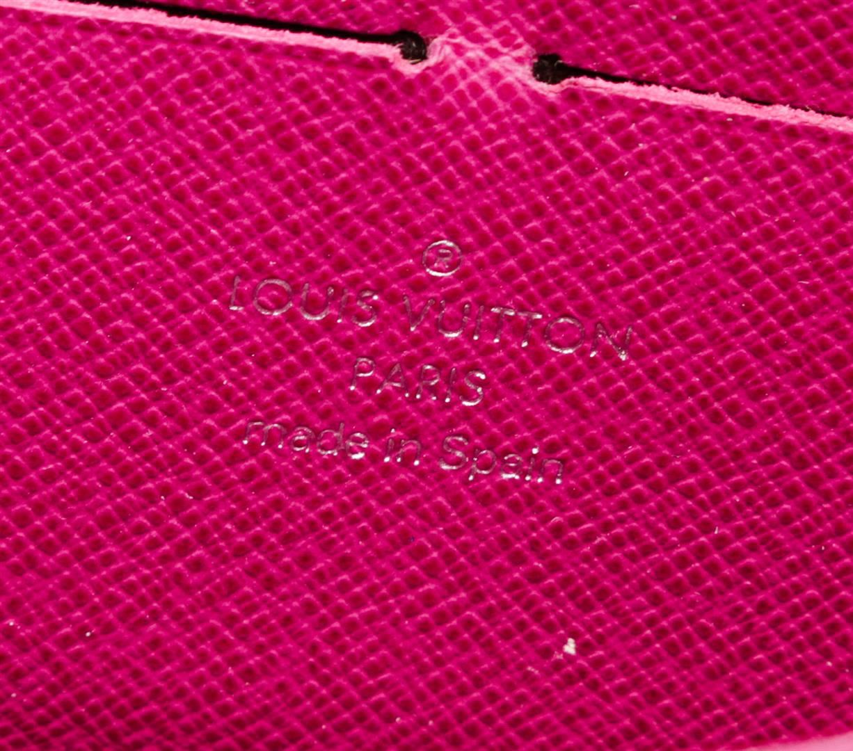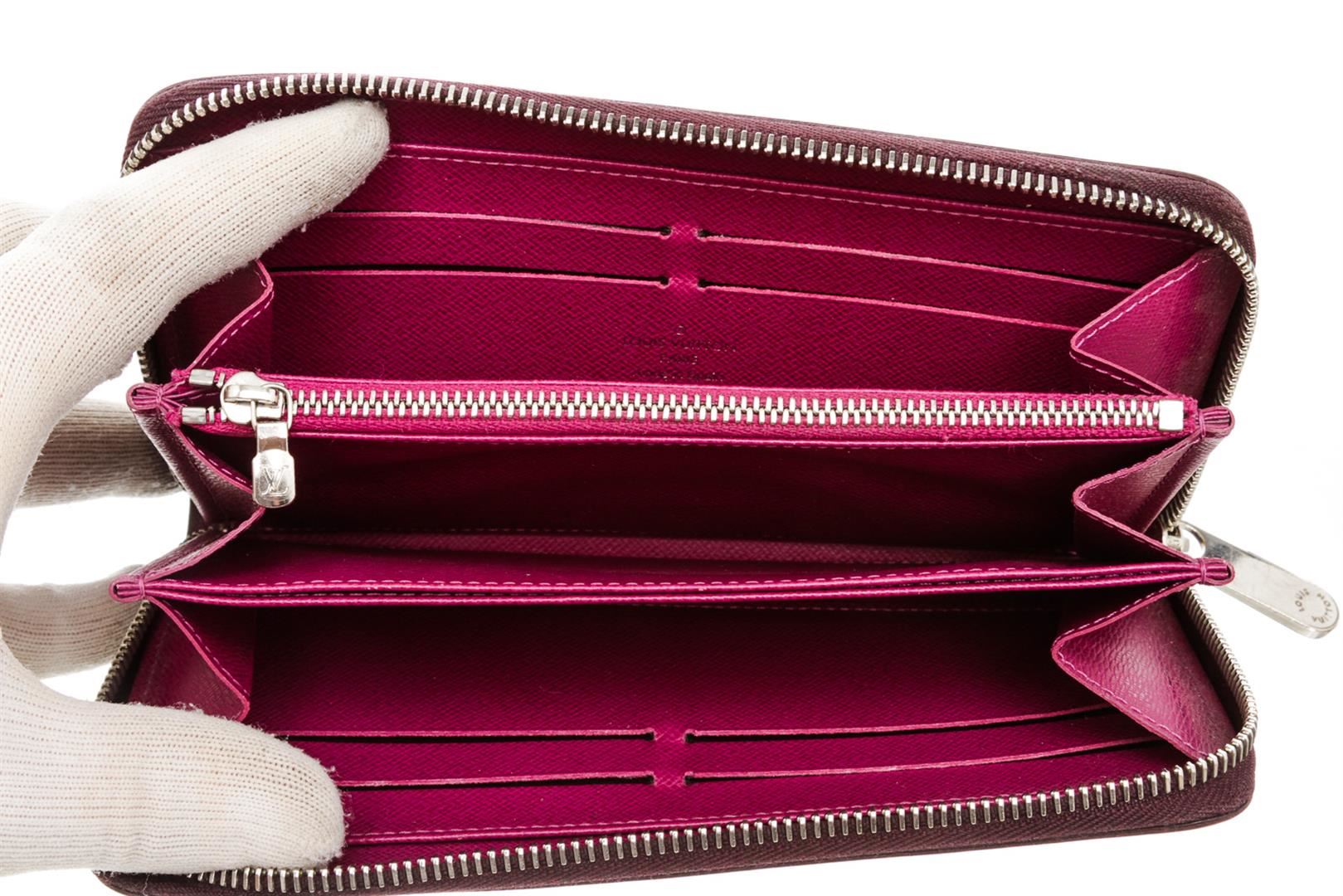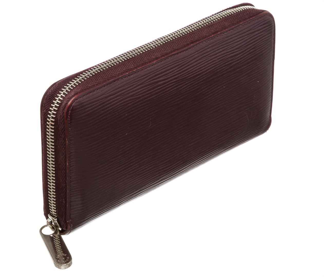 Purple Epi leather Louis Vuitton Zippy wallet with silver-tone hardware, tonal leather interior, five compartments; one with zip closure, dual bill compartments, eight card slots and zip-around closure at top.