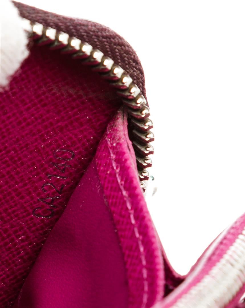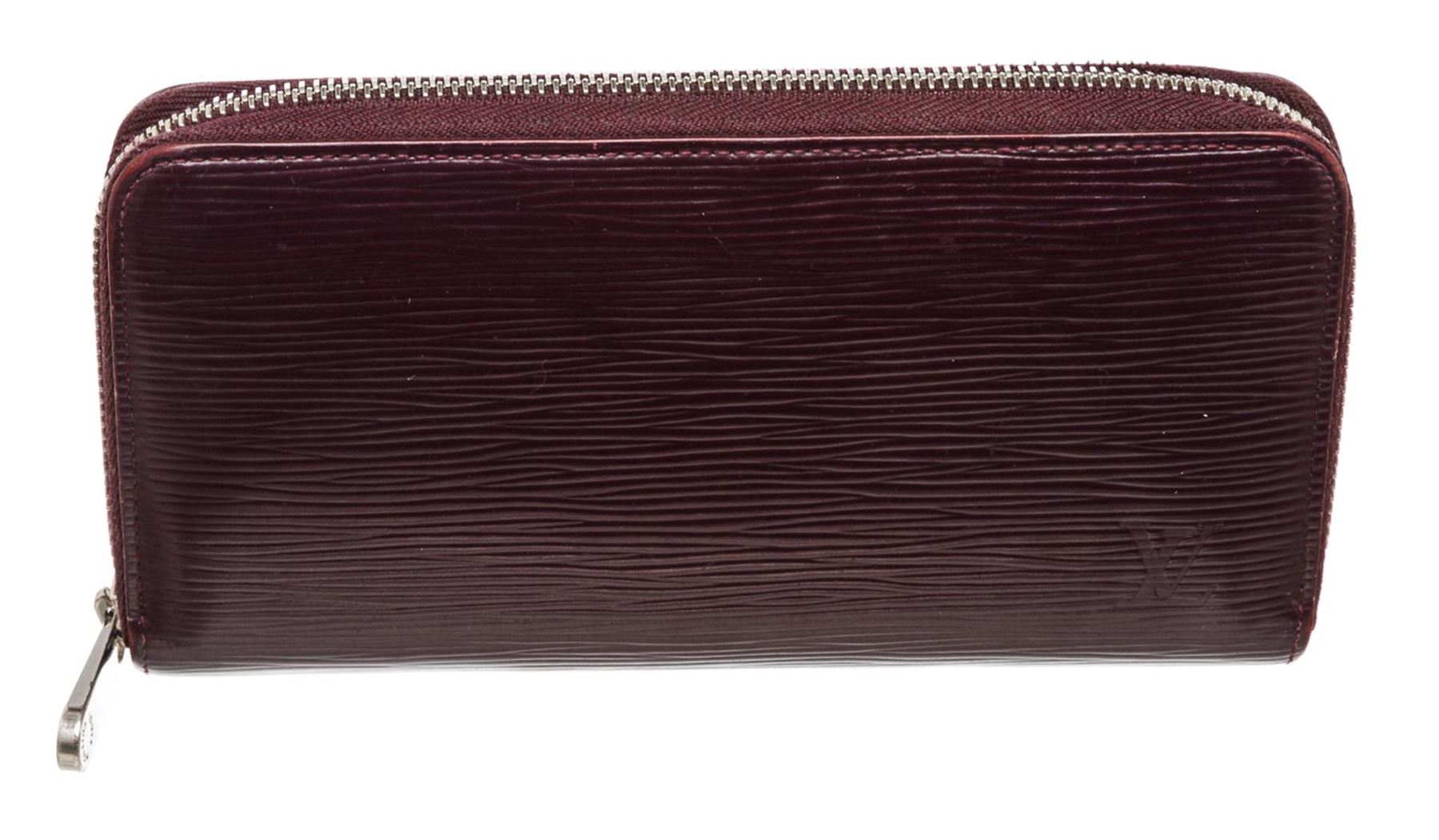 Purple Epi leather Louis Vuitton Zippy wallet with silver-tone hardware, tonal leather interior, five compartments; one with zip closure, dual bill compartments, eight card slots and zip-around closure at top.