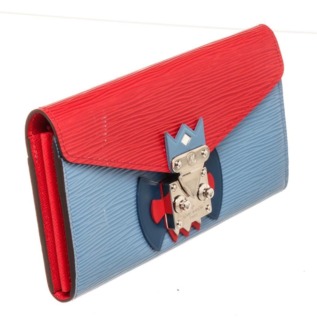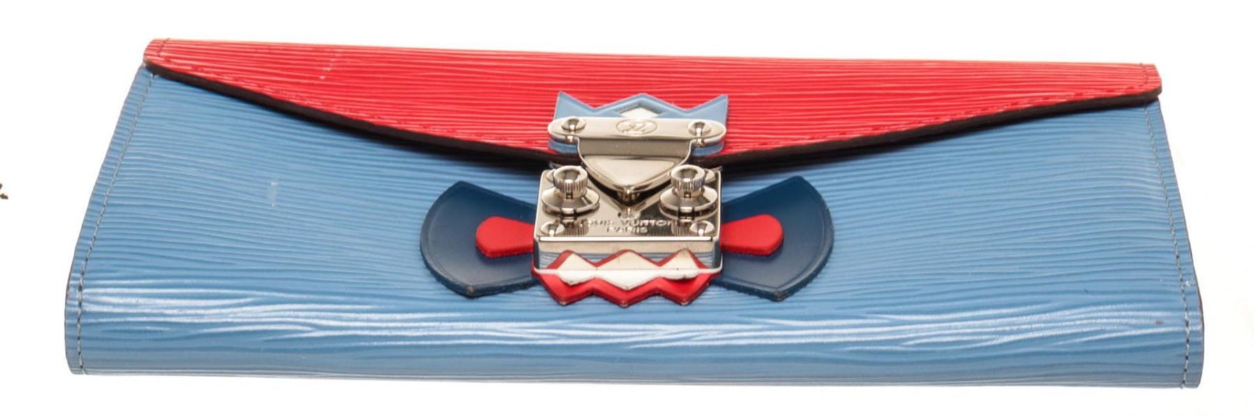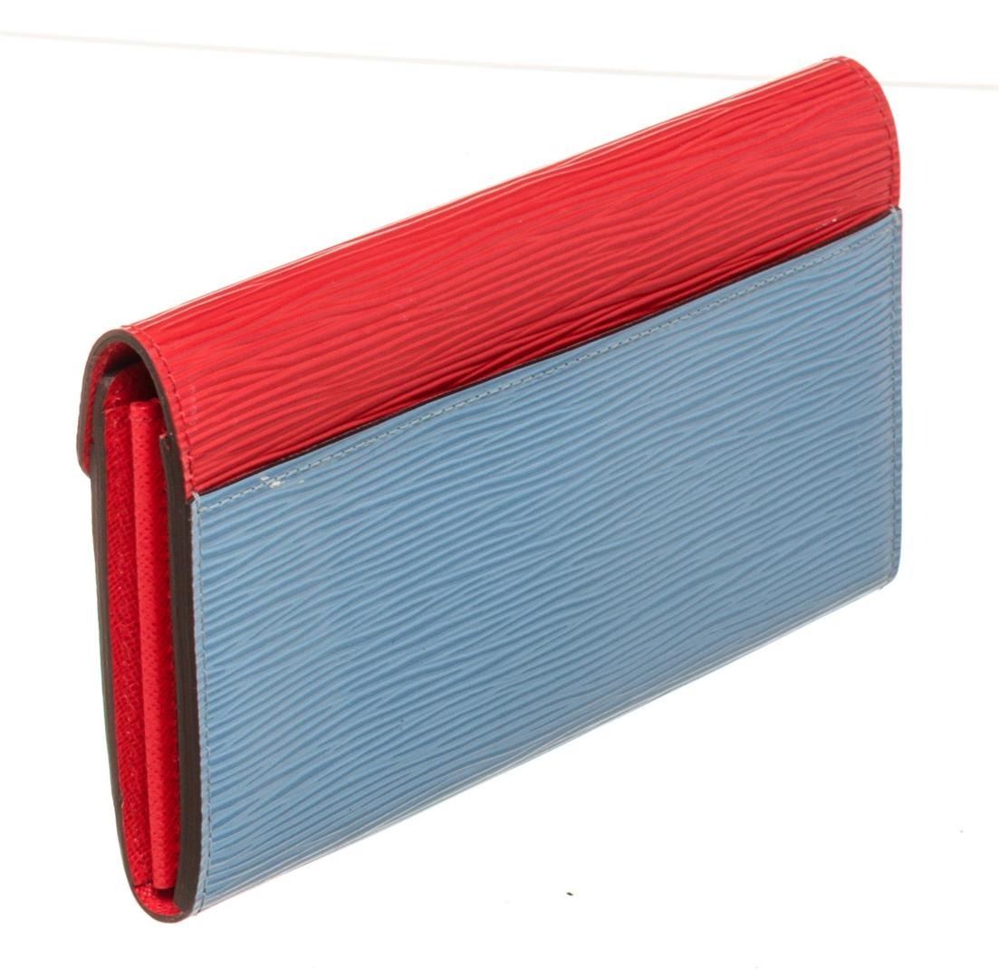 One Louis Vuitton Red Blue Leather Tribal wallet. Item is sold AS-IS. All available information is listed in the description and shown in the photo. Louis Vuitton Red Blue Leather Tribal wallet with leather, gold-tone hardware, trim tan vachetta leather, interior three compartments pocket and push lock closure.