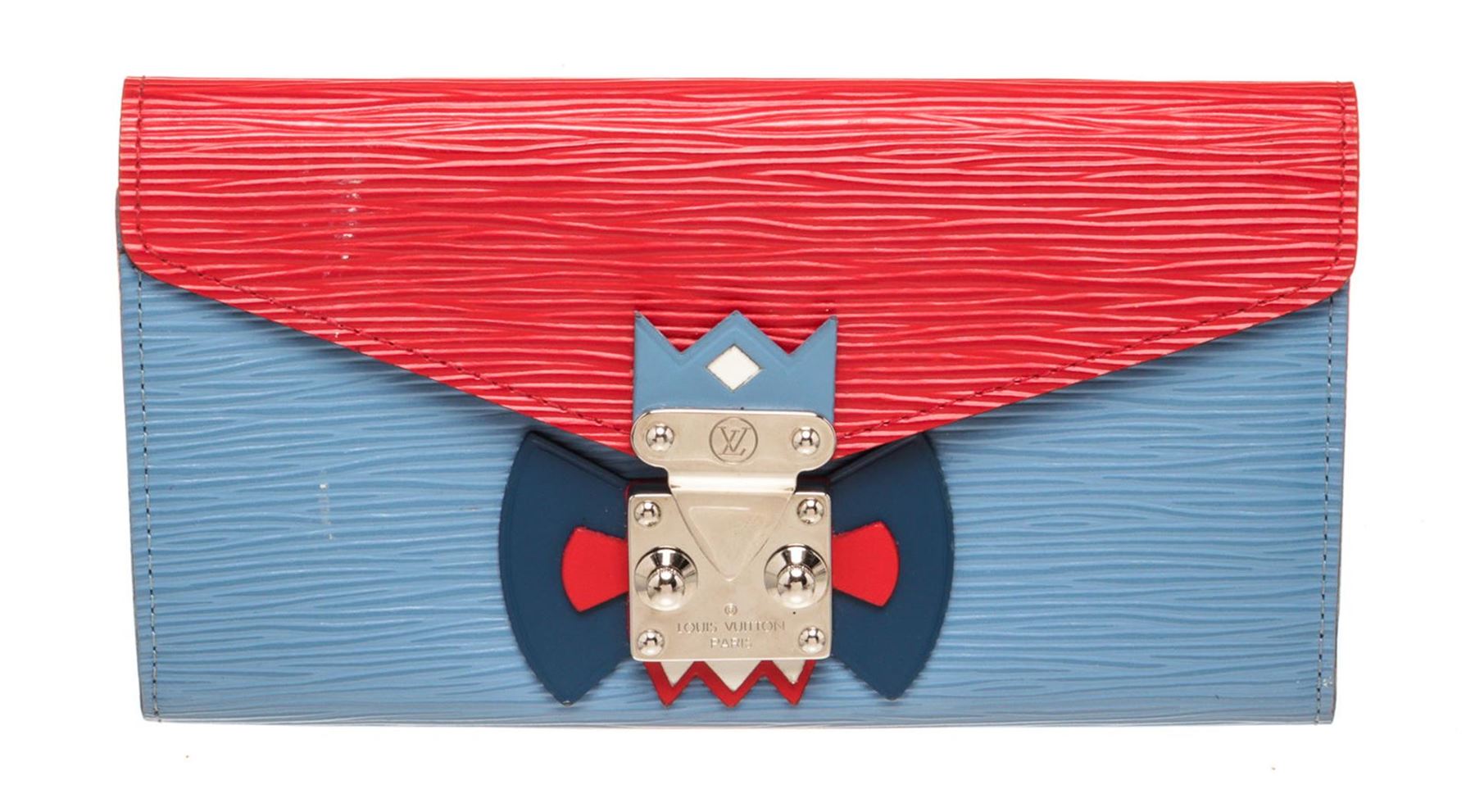 One Louis Vuitton Red Blue Leather Tribal wallet. Item is sold AS-IS. All available information is listed in the description and shown in the photo. Louis Vuitton Red Blue Leather Tribal wallet with leather, gold-tone hardware, trim tan vachetta leather, interior three compartments pocket and push lock closure.