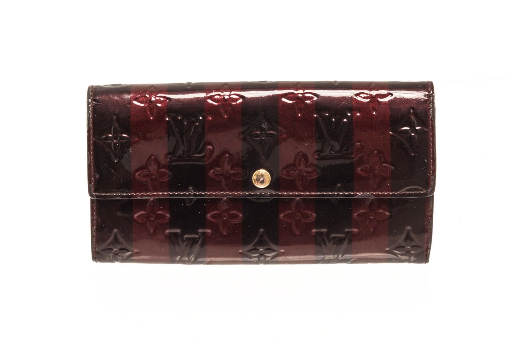 One Louis Vuitton Red Brown Vernis Leather Sarah Wallet. Item is sold AS-IS. All available information is listed in the description and shown in the photo. louis vuitton red brown leather sarah wallet.