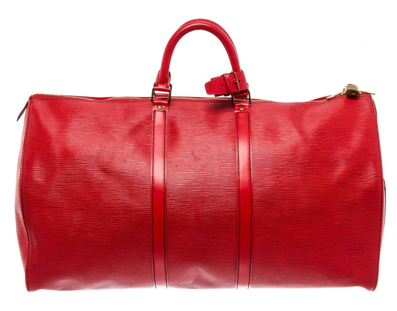 Louis Vuitton Red Epi Leather Keepall 55 Travel Bag. All available information is listed in the description and shown in the photos. Louis Vuitton Red Epi Leather Keepall 55 Travel Bag with gold-tone brass hardware, rolled handles & dual shoulder straps, suede lining & single interior pocket, top zipper closure. Condition Details: Slight creasing, minor wear/discoloration on bottom corners, some tarnishing on zipper pull. Height: 16" Width: 22" Depth: 10.5", Handle Drop: 4" / 40.64 x 55.88 x 26.67 cm