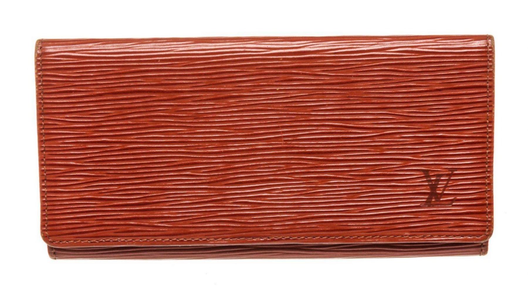 Louis Vuitton Red Epi Leather Long Flap Wallet. Louis Vuitton Red Epi Leather Long Flap Wallet with material epi leather, gold-tone hardware, trim tan vachetta leather, interior cardholder pockets and flap closure.