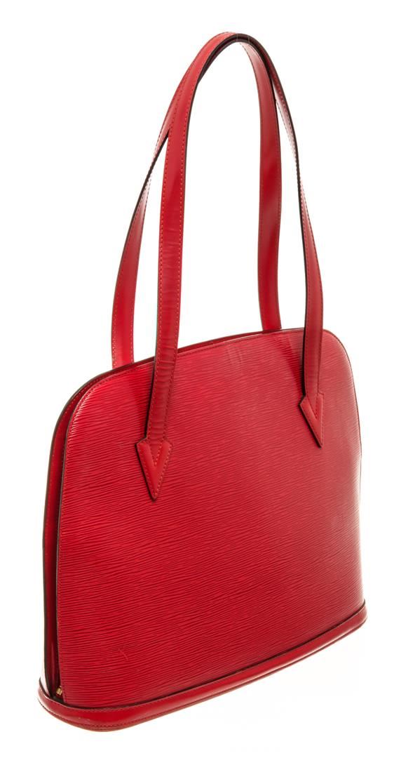 One Louis Vuitton Red Epi Leather Lussac Shoulder Bag. Item is sold AS-IS. All available information is listed in the description and shown in the photo. louis vuitton red epi leather lussac shoulder bag with gold tone hardware, adjustable strap. Height: 30.48 cm (12 in), Width: 36.83 cm (14.5 in), Depth: 11.43 cm (4.5 in)