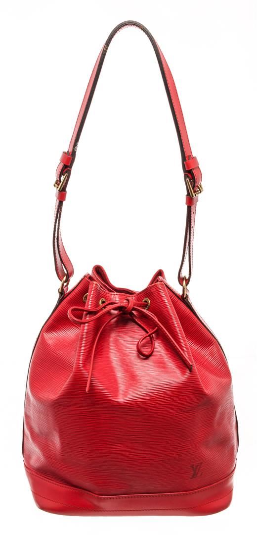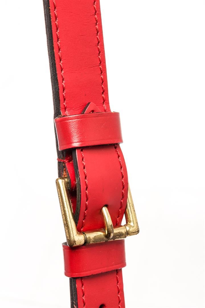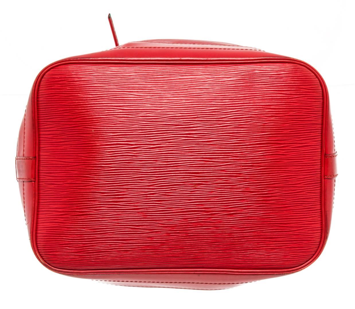 Louis Vuitton Red Epi Leather Noe Bucket Bag. All available information is listed in the description and shown in the photos. Louis Vuitton Red Epi Leather Noe Bucket Bag with red epi leather, printed, gold-tone hardware, single adjustable shoulder strap, alcantara lining, drawstring closure at top. Height: 13.5" Width: 10.5" Depth: 7.25" Shoulder Strap Drop: 8.5" / Height: 34.29 cm Width: 26.67 cm Depth: 18.41 cm Shoulder Strap Drop: 21.59 cm