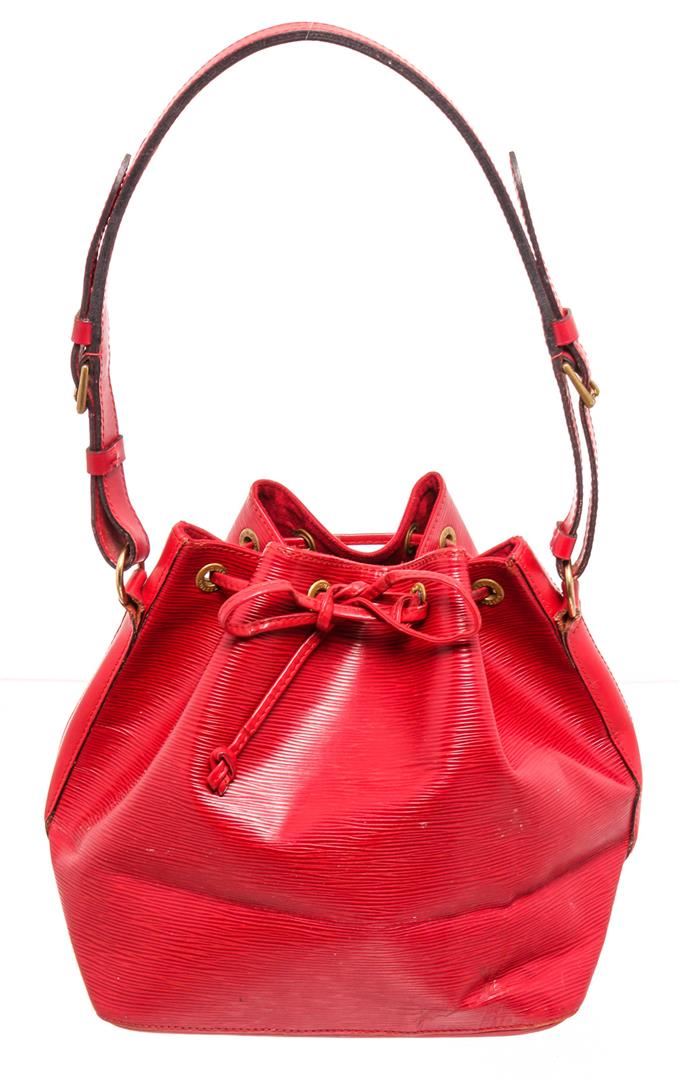 Red Epi leather Louis Vuitton Noe GM with brass hardware, single adjustable shoulder strap, tonal leather trim, embossed logo at exterior side, Alcantara lining and drawstring closure at top.