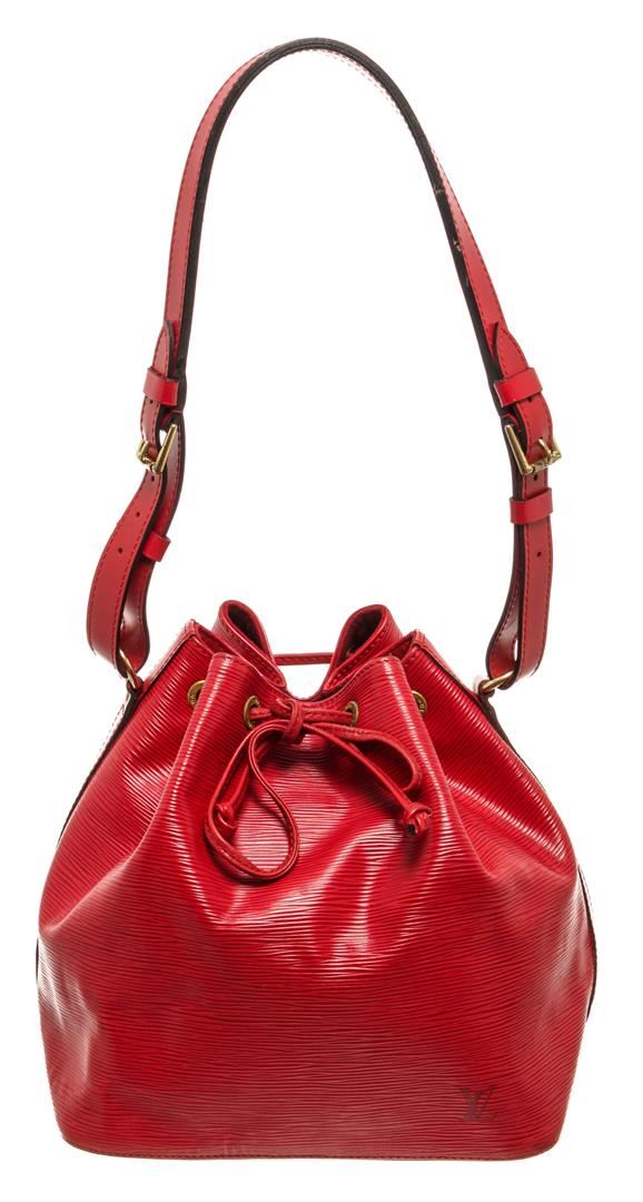 One Louis Vuitton Red Epi Leather Noe PM Bag. Item is sold AS-IS. All available information is listed in the description and shown in the photo. Louis Vuitton Red Epi Leather Petit Noe Bag with gold-tone hardware, red leather trim, red suede lining, single adjustable leather shoulder strap, and drawstring closure. .