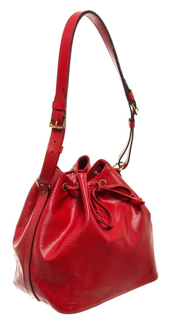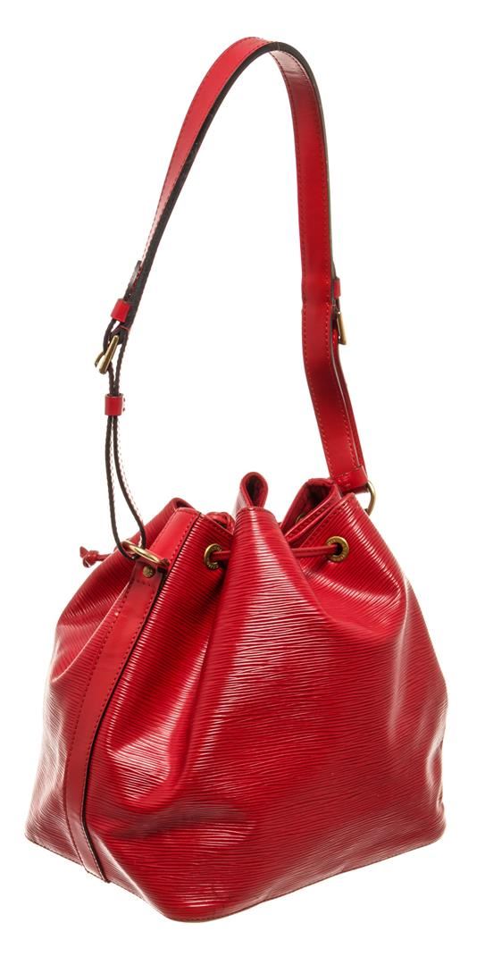 One Louis Vuitton Red Epi Leather Noe PM Bag. Item is sold AS-IS. All available information is listed in the description and shown in the photo. Louis Vuitton Red Epi Leather Petit Noe Bag with gold-tone hardware, red leather trim, red suede lining, single adjustable leather shoulder strap, and drawstring closure. .