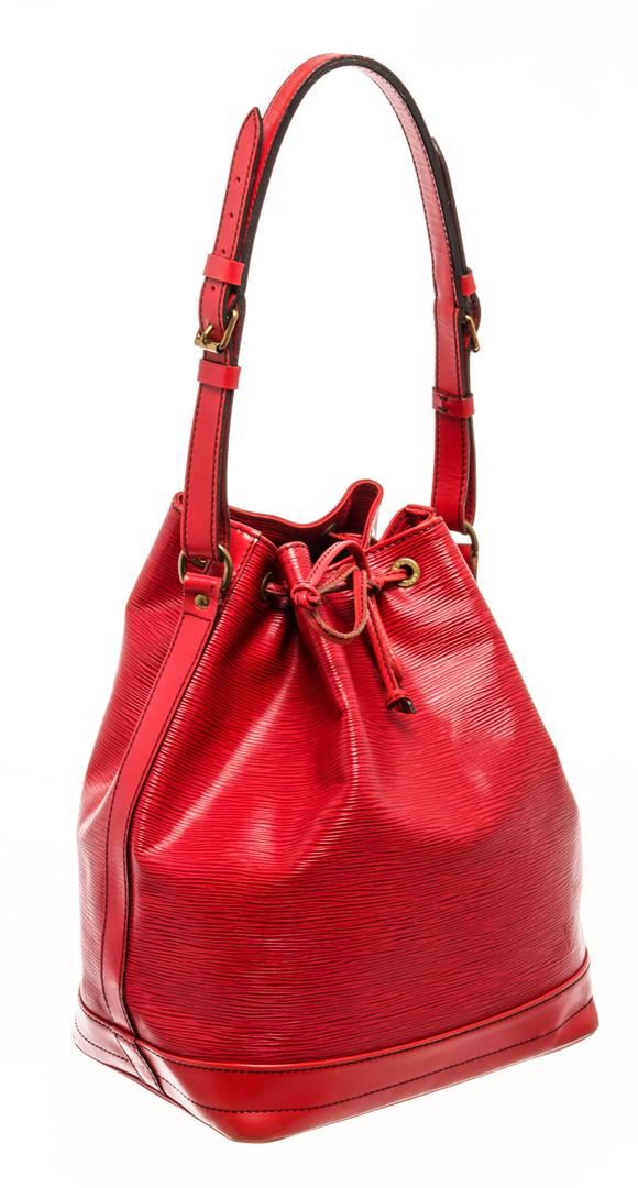 Louis Vuitton Red Epi Leather Noe Shoulder Bag. All available information is listed in the description and shown in the photos. Louis Vuitton Red Epi Leather Noe Shoulder Bag with red epi leather, printed, gold-tone hardware, single adjustable shoulder strap, alcantara lining, drawstring closure at top. Height: 13.5" Width: 10.5" Depth: 7.25" Shoulder Strap Drop: 8.5" / Height: 34.29 cm Width: 26.67 cm Depth: 18.41 cm Shoulder Strap Drop: 21.59 cm