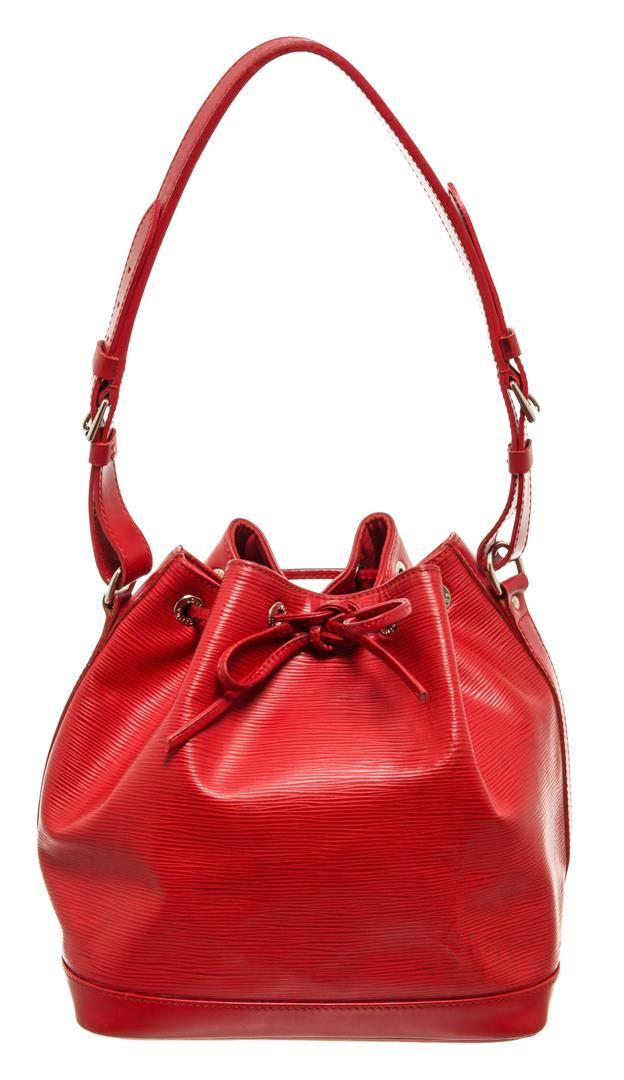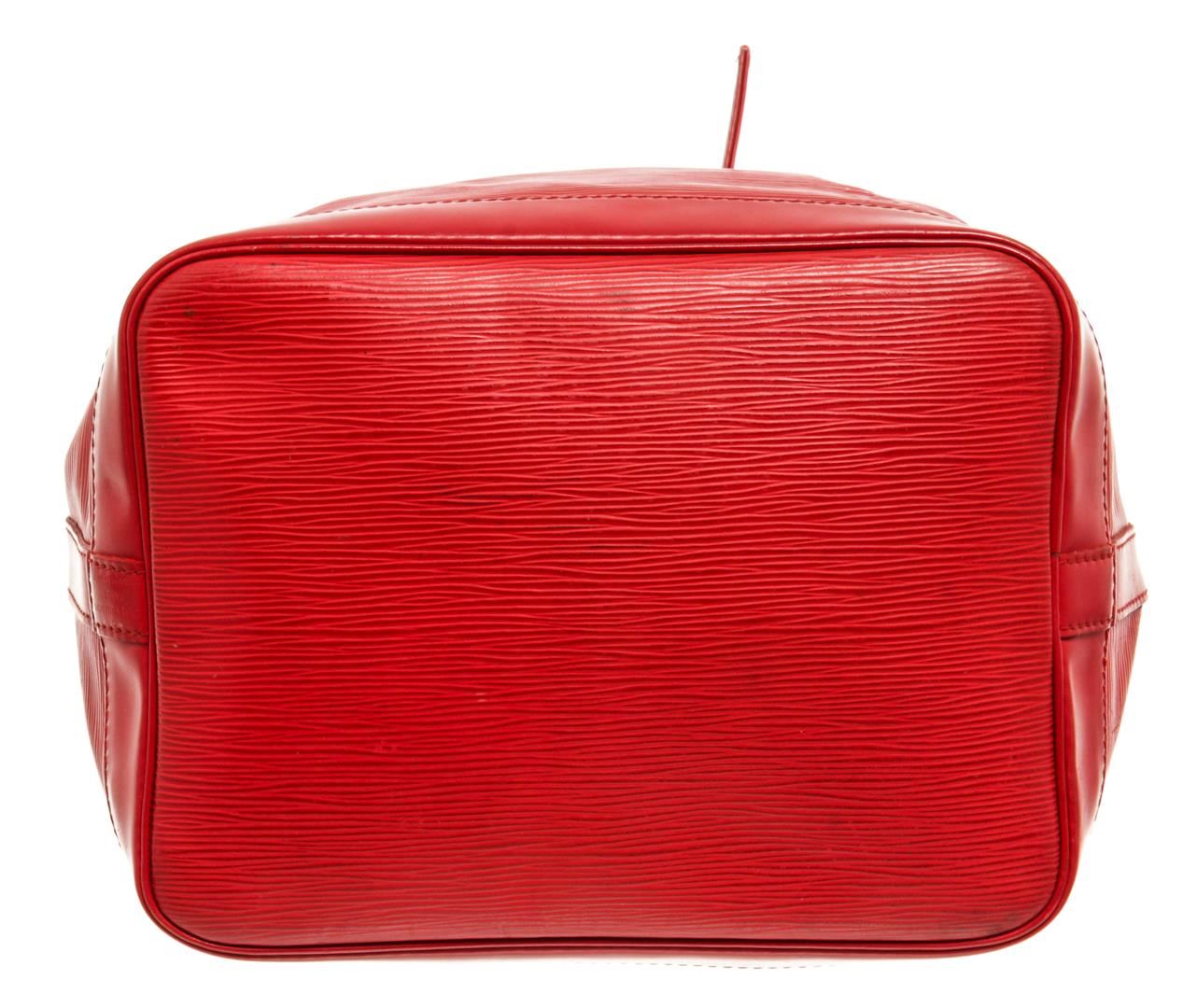 One Louis Vuitton Red Epi Leather Petit Noe Bag. Item is sold AS-IS. All available information is listed in the description and shown in the photo. Louis Vuitton Red Epi Leather Petit Noe Bag with silver-tone hardware, red leather trim, red suede lining, single adjustable leather shoulder strap, and drawstring closure. .