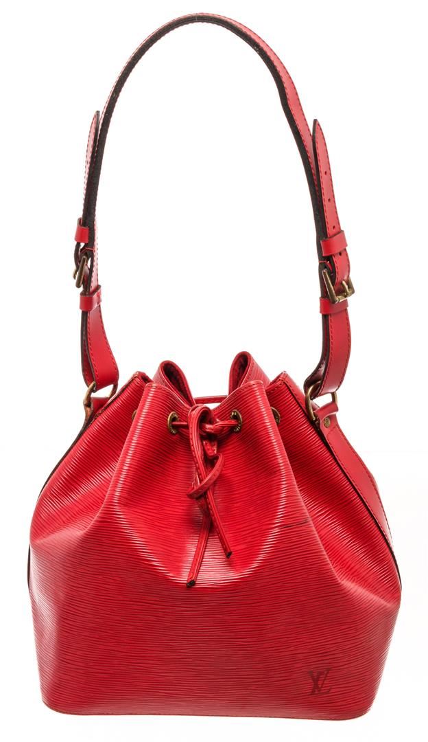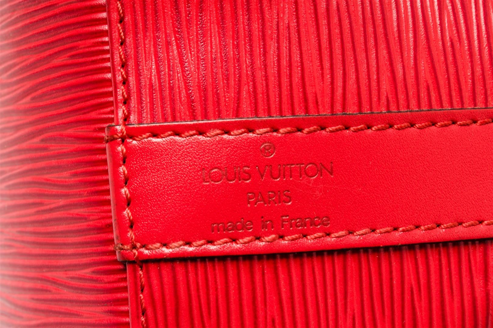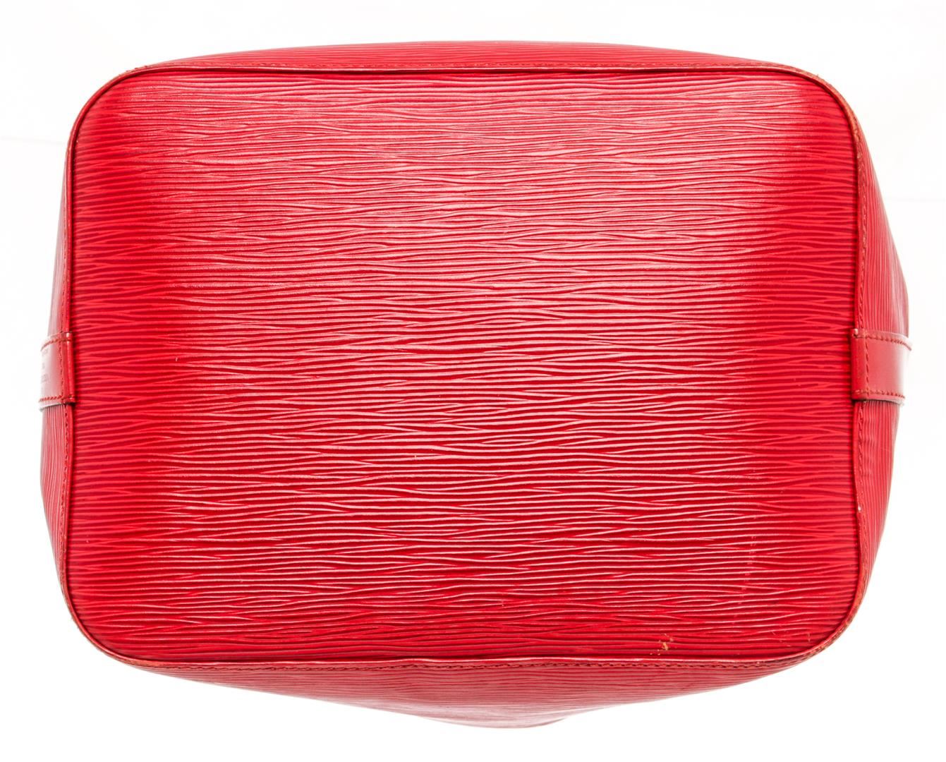 Louis Vuitton Red Epi Leather Petit Noe Bucket Bag. All available information is listed in the description and shown in the photos. Louis Vuitton Red Epi Leather Petit Noe Bucket Bag with vintage, red epi leather, colorblock pattern, brass hardware, leather trim, single adjustable shoulder strap, leather trim embellishment, alcantara lining & single interior pocket, drawstring closure at front Height: 10.5" Width: 9.5" Depth: 7" Shoulder Strap Drop: 10.5" / Height: 26.67" Width: 24.13" Depth: 17.78" Shoulder Strap Drop: 26.67"