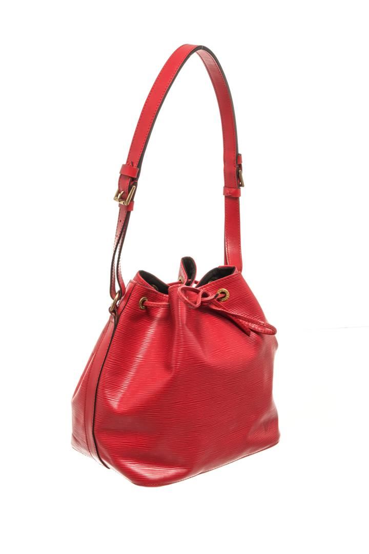 Louis Vuitton Red Epi Leather Petit Noe Bucket Bag. All available information is listed in the description and shown in the photos. louis vuitton red epi leather petit noe bucket bag with the petit noe features an epi leather body, an adjustable shoulder strap, and a drawstring closure. Height: 10.6" Width: 9.4" Depth: 5.9", Handle Drop: / 26.92 x 23.87 x 18.03 Cm