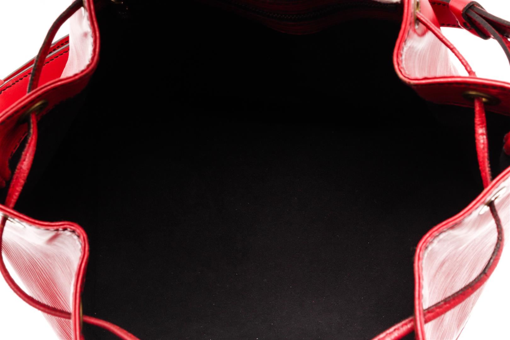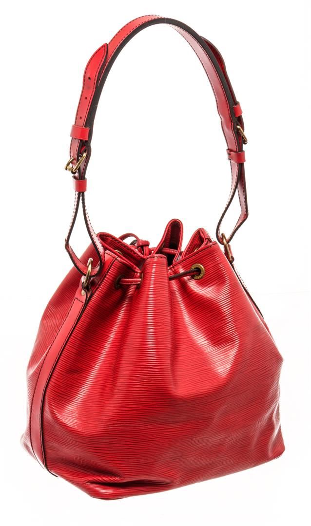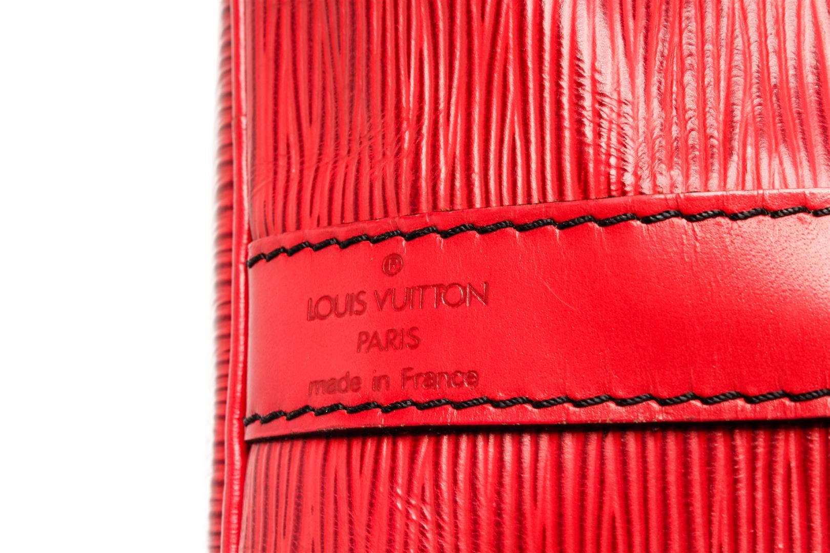 Louis Vuitton Red Epi Leather Petit Noe Shoulder Bag. All available information is listed in the description and shown in the photos. Louis Vuitton Red Epi Leather Petit Noe Shoulder Bag with red epi leather, brass hardware, single adjustable shoulder strap, alcantara lining, drawstring closure at top. Height: 10" Width: 15.5" Depth: 7" Shoulder Strap Drop: 9" / Height: 25.4" Width: 39.37" Depth: 17.78" Shoulder Strap Drop: 22.86"