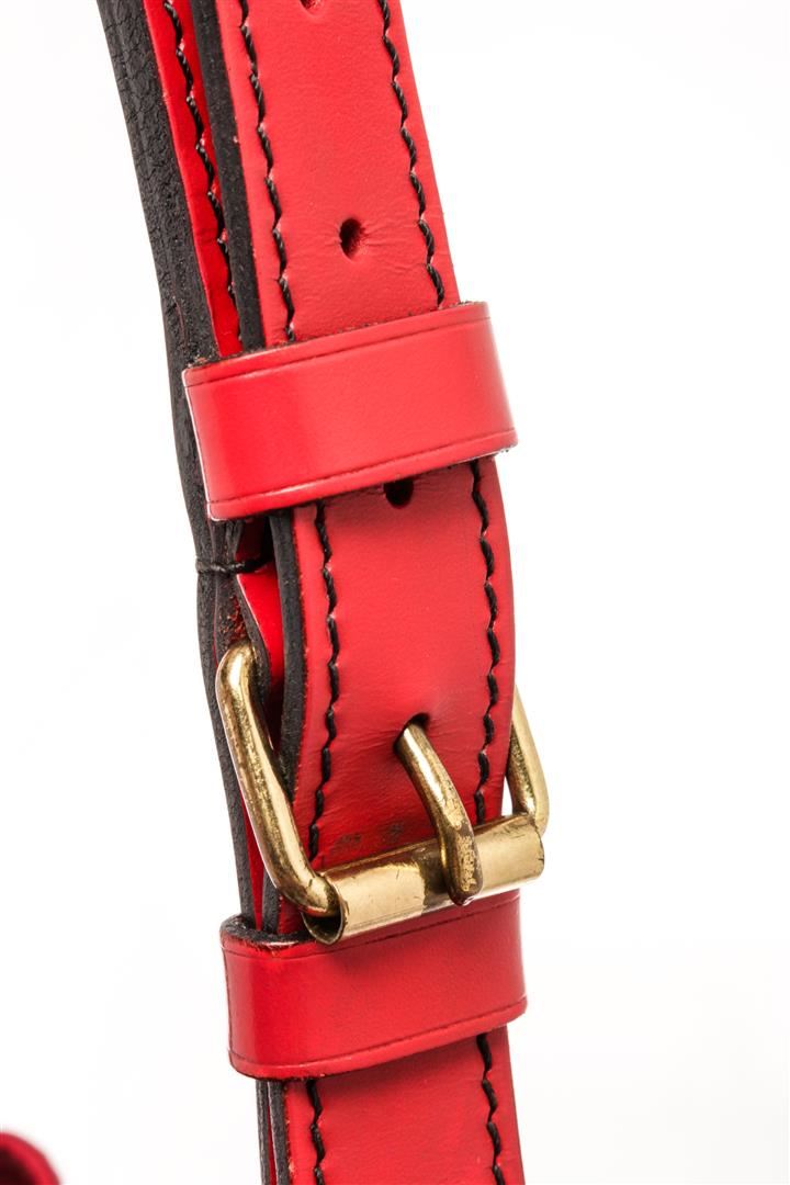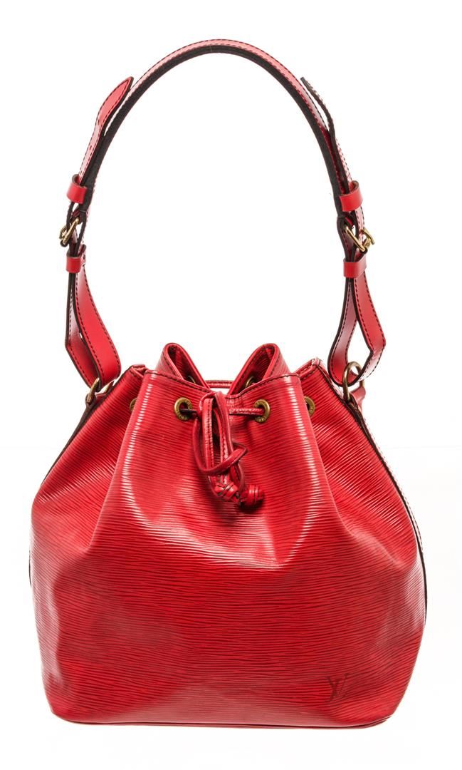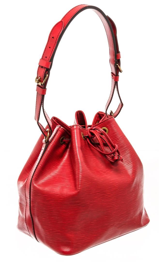 Louis Vuitton Red Epi Leather Petit Noe Shoulder Bag. All available information is listed in the description and shown in the photos. Louis Vuitton Red Epi Leather Petit Noe Shoulder Bag with red epi leather, brass hardware, single adjustable shoulder strap, alcantara lining, drawstring closure at top. Height: 10" Width: 15.5" Depth: 7" Shoulder Strap Drop: 9" / Height: 25.4" Width: 39.37" Depth: 17.78" Shoulder Strap Drop: 22.86"