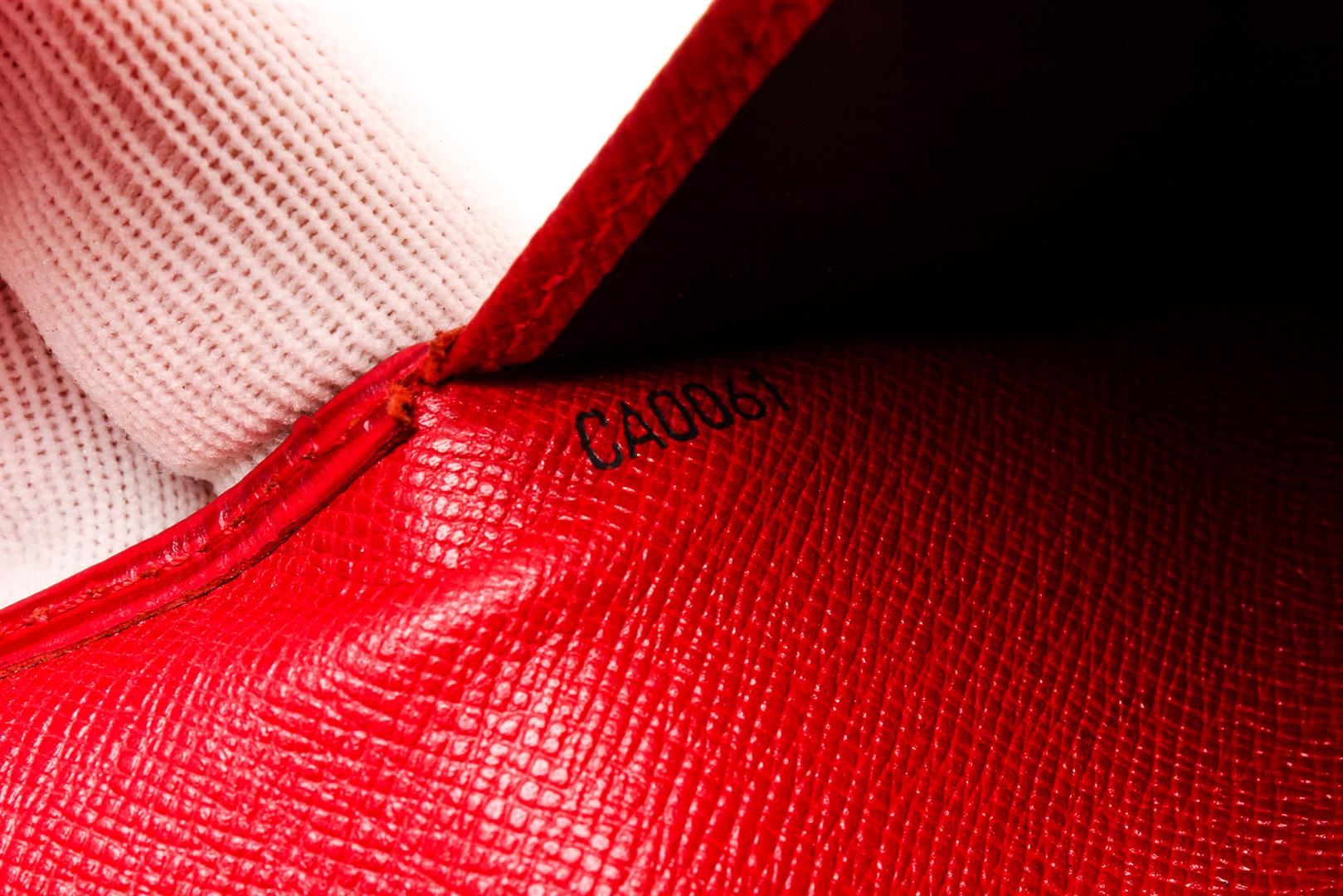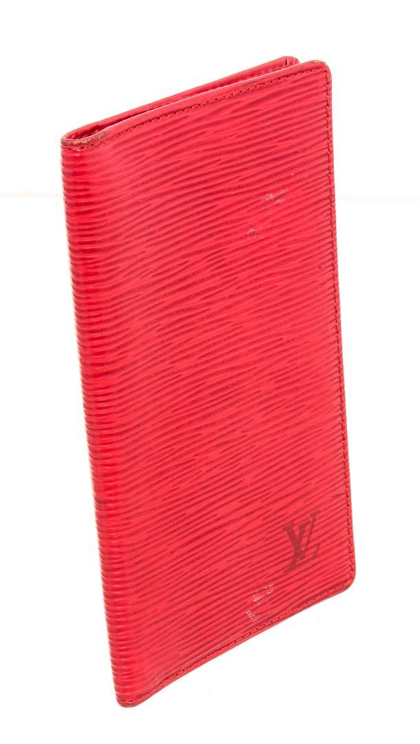 Red Epi leather Louis Vuitton pocket agenda cover with debossed logo at front corner, tonal Taiga leather lining, dual interior bill compartments, three interior card slots and bifold closure at exterior.
