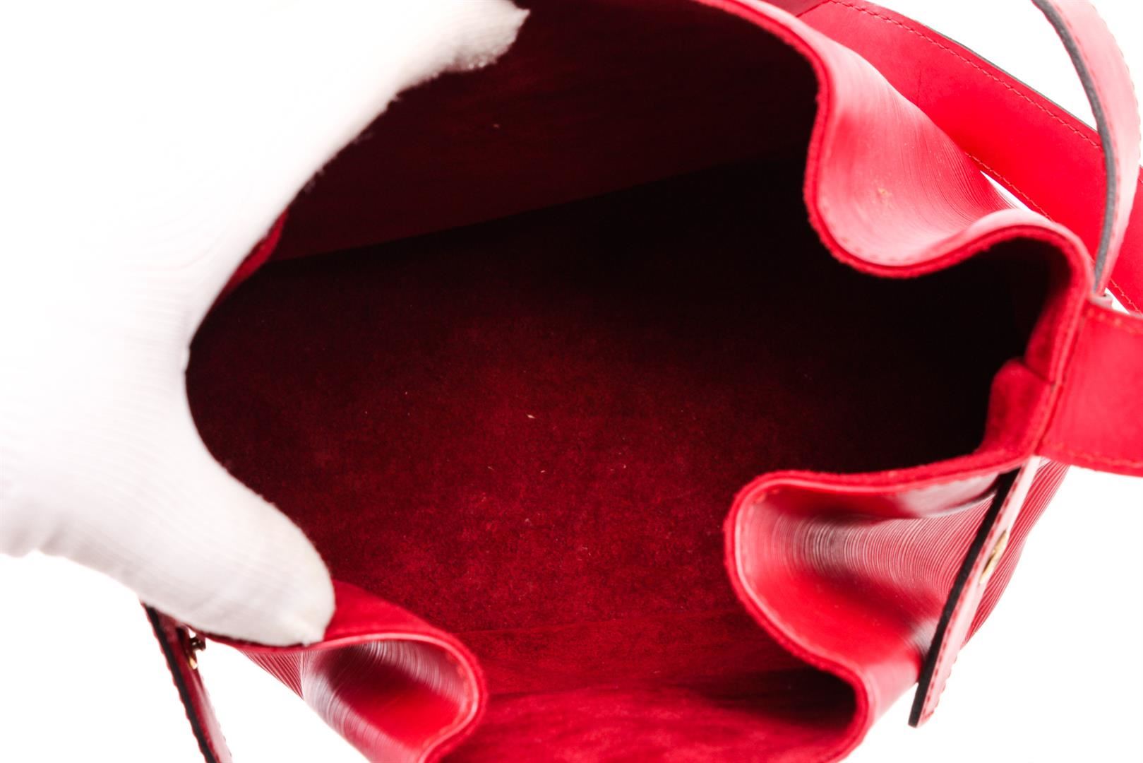 Red Epi leather Louis Vuitton Sac D'epaule with silver-tone hardware, flat adjustable shoulder strap, tonal Alcantara lining and snap closure at front.