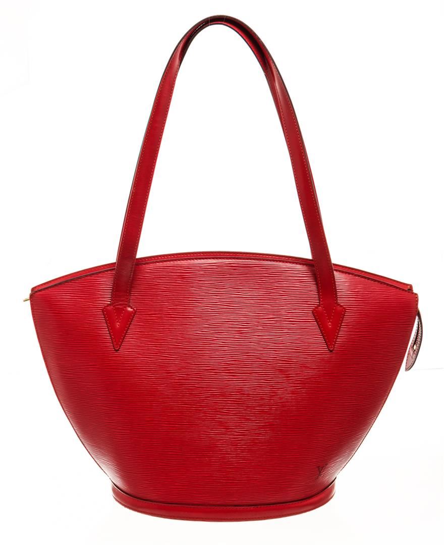 One Louis Vuitton Red Epi Leather Saint Jacques Shoulder Bag. Item is sold AS-IS. All available information is listed in the description and shown in the photo. louis vuitton red epi leather saint jacques shoulder bag with gold-tone hardware, debossed logo to the front, top zip fastening, two long top handles, internal jetted pocket, internal logo patch, leather lining, Depth 6.7 in, Height 11.8 in, Strap 9.4 in, Width c in / Depth 17 cm, Height 30 cm, Strap 24 cm, Width 26 cm