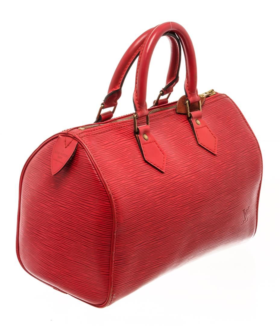 One Louis Vuitton Red Epi Leather Speedy 25 Satchel Bag. Item is sold AS-IS. All available information is listed in the description and shown in the photo. Louis Vuitton Red Epi Leather Speedy 25 Satchel Bag with top handle, exterior side pocket, suede lining, interior slip pocket, gold tone hardware, zipper closure. There is stain on the suede lining, a scratch on the leather. Please refer to photos. Depth 5.9 in, Height 7.9 in, Width 11 in, Handle 3.1 in/ Depth 15 cm, Height 20 cm, Width 28 cm, Handle 8 cm